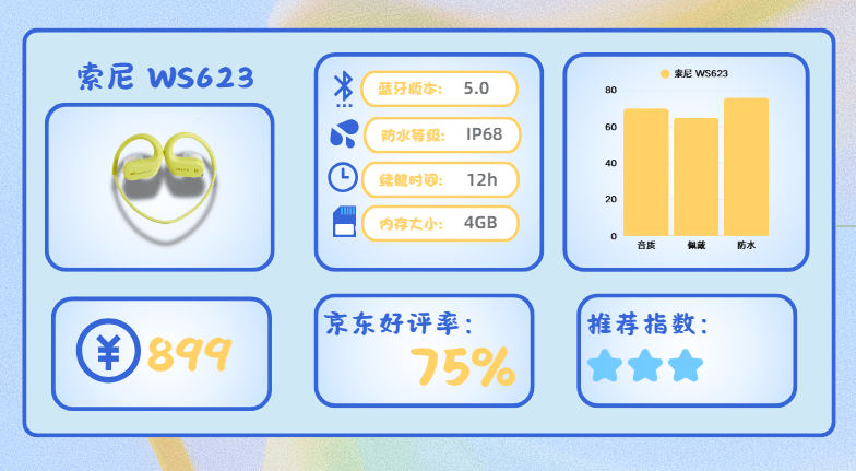 功能配置上,WS623 内置 4GB 存储空间,支持 MP3 离线播放,不依赖手机即可独立使用,让水下运动也能保持完整的听歌体验。机身采用简约流线造型,蓝色外观清爽醒目,整体贴合人体工学,轻量化设计兼具运动感与科技感。