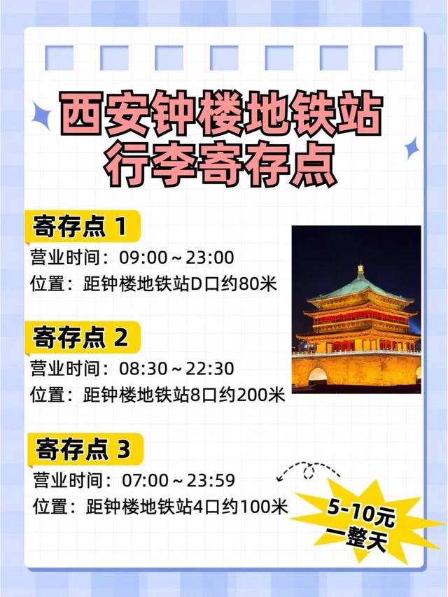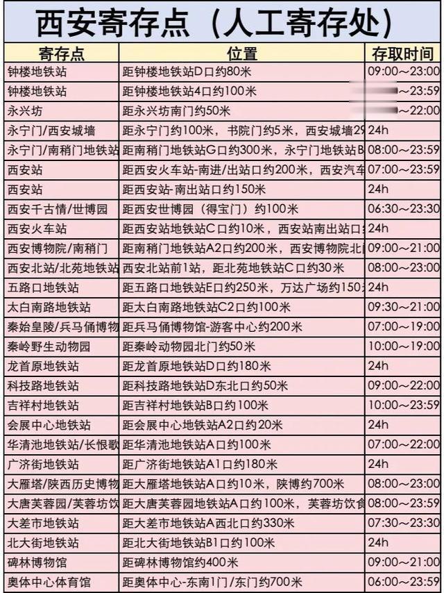 不管是旅游、出差、或者去看演唱会,只要在景区、商场、车站、地铁站,都有行李寄存处【西安交通】机场:西安咸阳国际机场• 机场大巴:多条线路直达西安市区,包括钟楼、西安北站等重要地点,票价约25-30元/人。火车站/高铁站:西安站、西安北站(高铁站)• 西安站位于市中心,周边交通极为便利,地铁1号线、多条公交线路及出租车服务一应俱全。• 西安北站作为西北地区最大的高铁站,地铁2号线、4号线交汇,快速连接市区及周边景区。市区-古城墙:可乘坐地铁或公交至南门(永宁门)等城门进入,亦可骑行环绕古城墙,感受千年古都的韵味。市区-大雁塔:地铁3号线、4号线直达大雁塔站,出站后步行即可到达大雁塔及大唐不夜城。