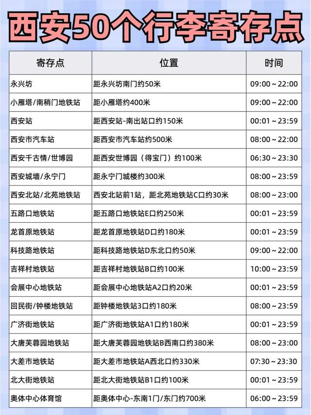 以下是部分寄存点:机场/车站•西安火车站(7个)•元朔路地铁站/西安北站(3个)•西安市汽车站·寄存点-景点/商圈•五路口地铁站/民乐园·寄存点•安远门/明城墙·寄存点•回民街/钟楼·寄存点•永兴坊·寄存点•南稍门地铁站·寄存点•大雁塔·寄存点•小寨地铁站/赛格购物中心·寄存点•大唐芙蓉园/芙蓉坊饮食街·寄存点•西安博物院/南稍门·寄存点•太白南路地铁站·寄存点•碑林博物馆·寄存点•西安城墙/永宁门·寄存点•朝阳门地铁站·寄存点•秦始皇陵/兵马俑博物馆·寄存点•电视塔/陕西自然博物馆·寄存点