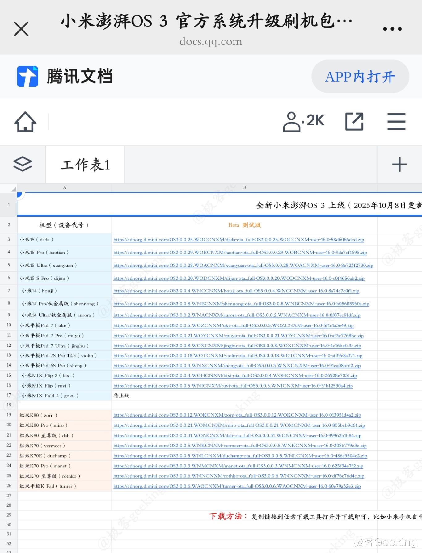 如何获取全新小米澎湃OS 3 的官方系统升级刷机包下载?就像初代和澎湃OS 2,这次极客君依然做了一个在线文档,持续更新小米澎湃OS 3 的系统包下载链接,包括 Beta 版和正式版,关注我并私信发送口令 “澎湃OS3” 即可获取。