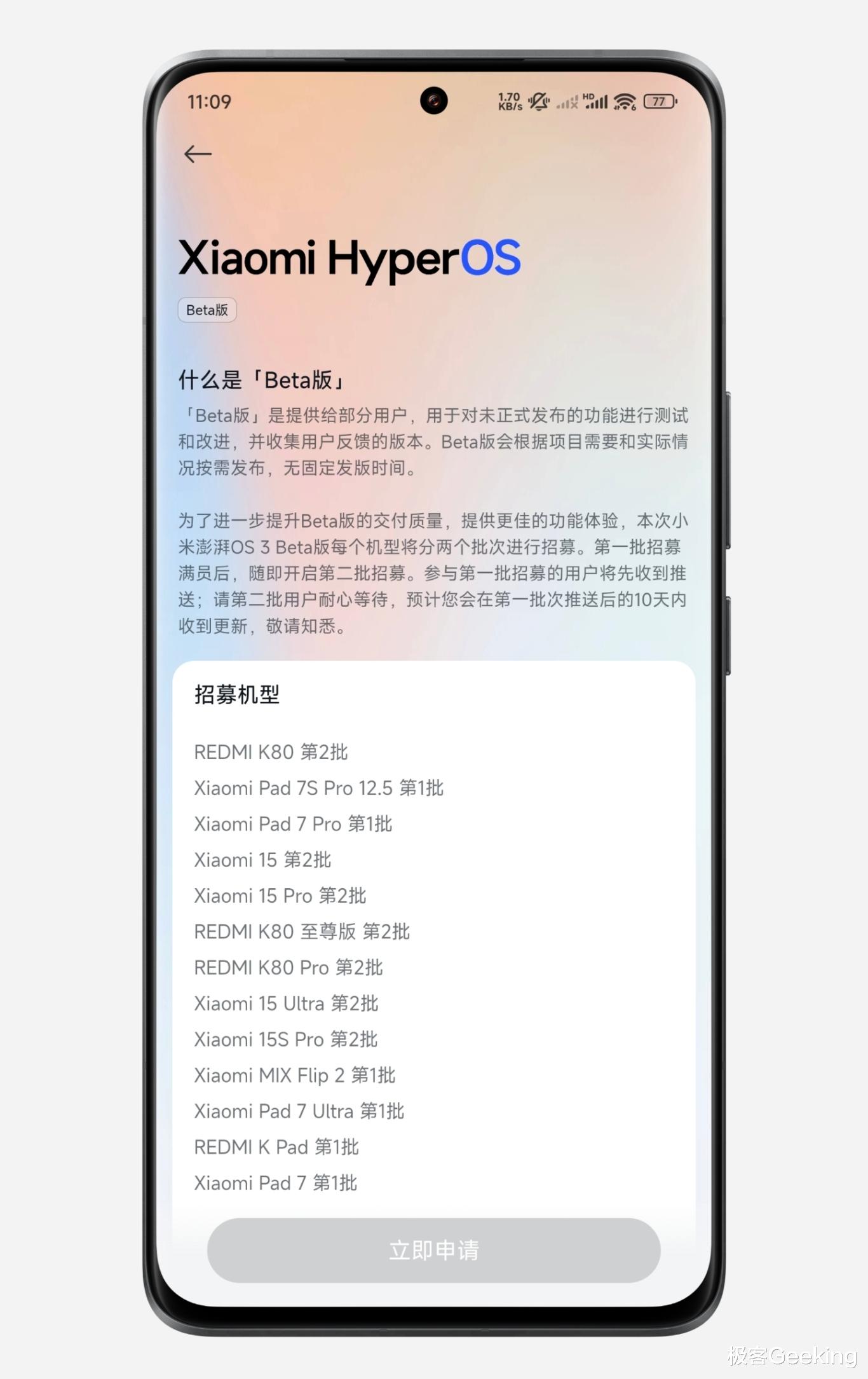点击右侧的「申请」按钮进入小米澎湃OS 3 Beta 版的报名申请界面,在这里首先能看到当前在招募 Beta 计划的机型和说明。