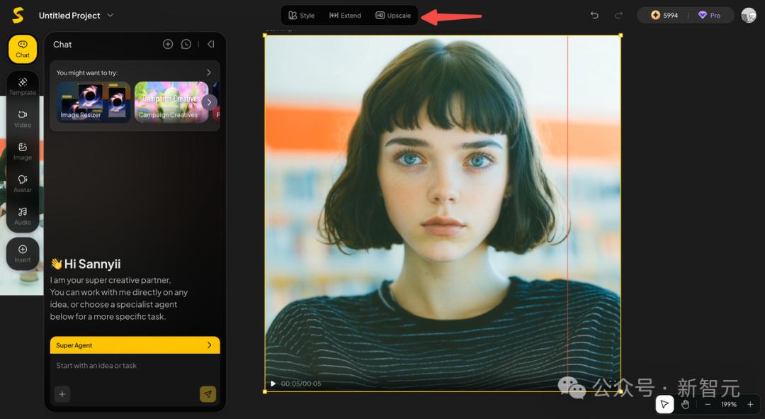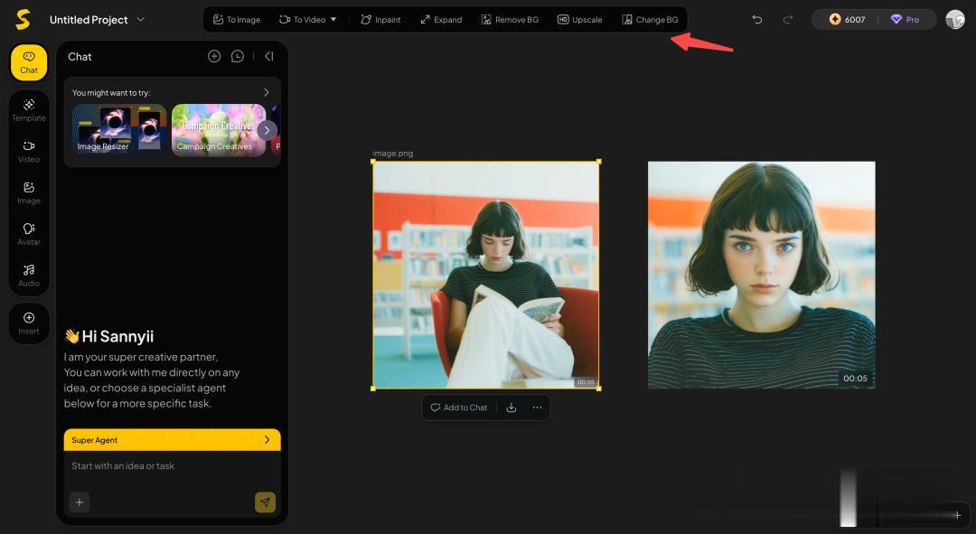 可以一步直达所需功能,比如图片可以扩充、移除背景等,下面就是一键将1:1的照片扩充为16:9的照片。