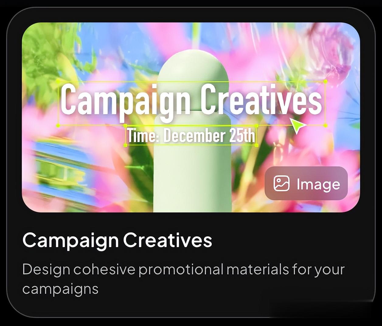 比如,新店开业,需要一套宣传物料,直接使用「创意活动」(Campaign Creatives),即可快速设计营销活动宣传材料。