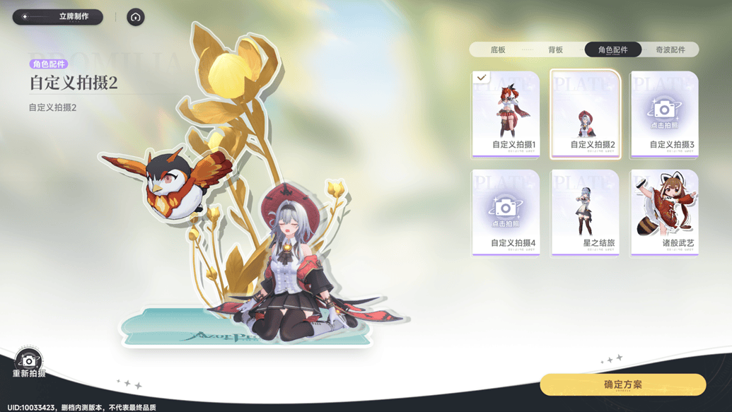 此外在二测里,相机功能也被做得诚意满满。Pose、时间、打光、背景、风速都能自己调,甚至还能切绿幕。我已经能想象到公测之后,玩家社区会拿这个功能整出多少活了:各种小剧场、名场面复刻、表情包素材……UGC的潜力非常大。此外主页名片自定义也是同样的思路,3D场景里随便摆角色、家具、贴纸,还可以为喜欢的角色做一张专属立牌,只要这些个性化功能做到位了,内容会自己从社区里长起来。