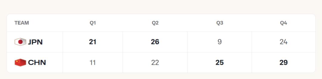 下半场回来后,中国男篮调整了防守策略,然后开局就打了一波日本男篮13-0,第三节单节限制日本男篮只得到9分,三节结束,中国男篮已经以58-56反超2分。