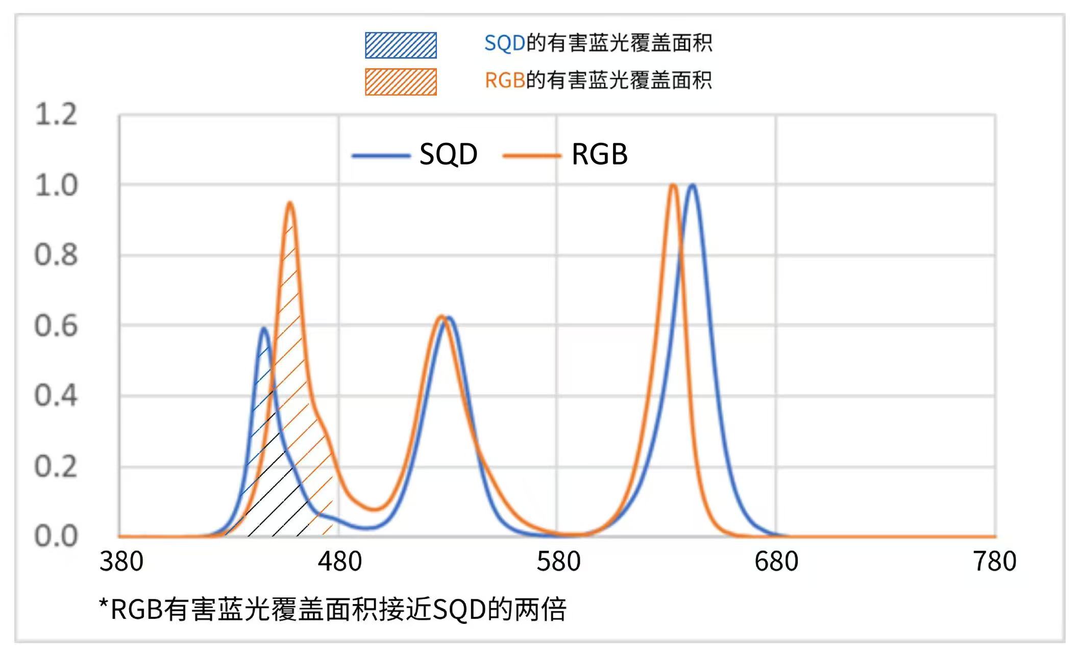 而比较靠谱的是SQD-Mini LED技术,直接从源头减少蓝光的总能量,把对眼睛的刺激降到最低。实测数据也很直观,同样条件下,RGB方案的有害蓝光能量差不多是SQD的两倍,符合国标只是最基础的安全线,SQD这种防蓝光的技术路线,才是真的能让娃、老人久看也不酸涩的舒适级护眼。