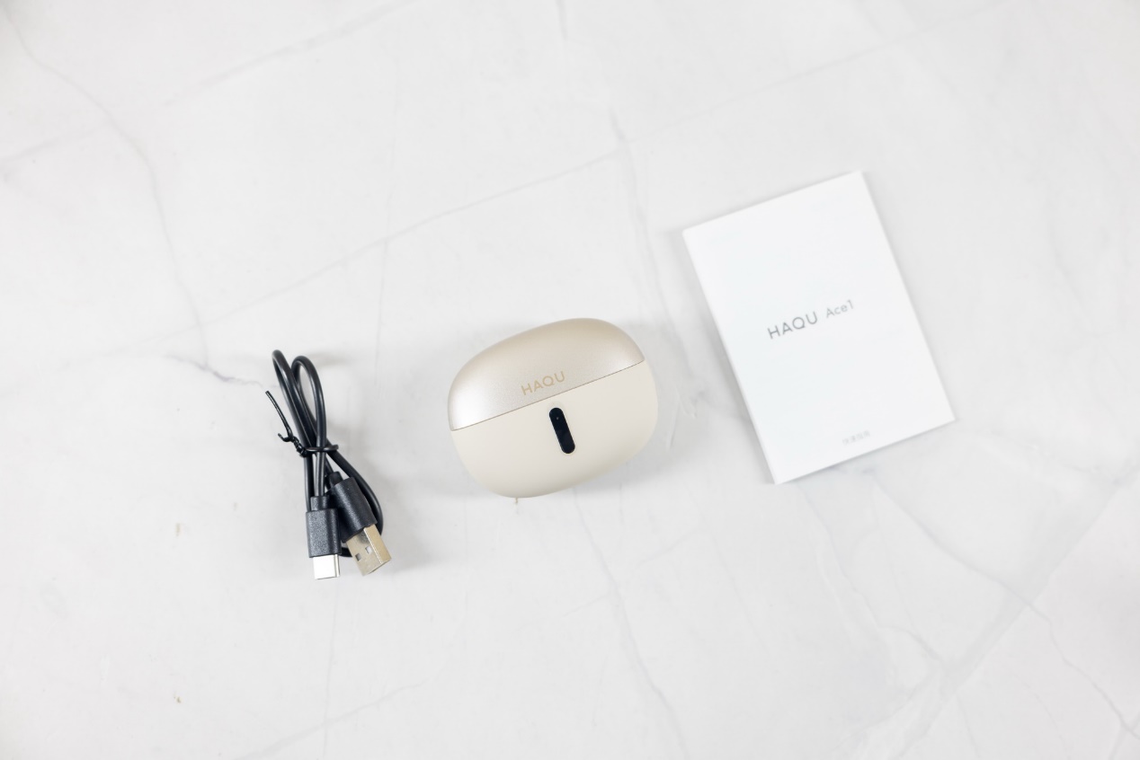 打开包装盒,里面有哈趣ACE1耳夹式耳机+充电仓,Type-C充电线和使用说明书。
