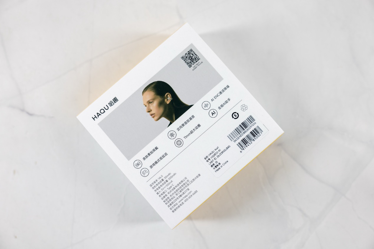 哈趣ACE1耳夹式耳机的包装盒比较小巧,左上角是哈趣的品牌Logo,中间是耳机的渲染图,包装盒背面介绍了耳机的功能亮点。