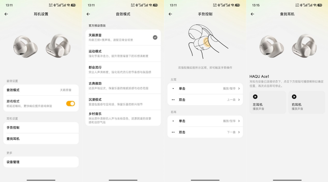 此外还可以对哈趣ACE1耳夹式耳机进行更细致的设定,如音效模式,预设有6种模式可以自由切换,还能开启游戏模式,降低延迟,提升游戏体验。手势控制对于听音乐和接打电话都非常方便。查找耳机这个功能也很重要,毕竟哈趣ACE1耳夹式耳机这么小,有时候随手一放,回头要找半天,这个功能就很方便了。