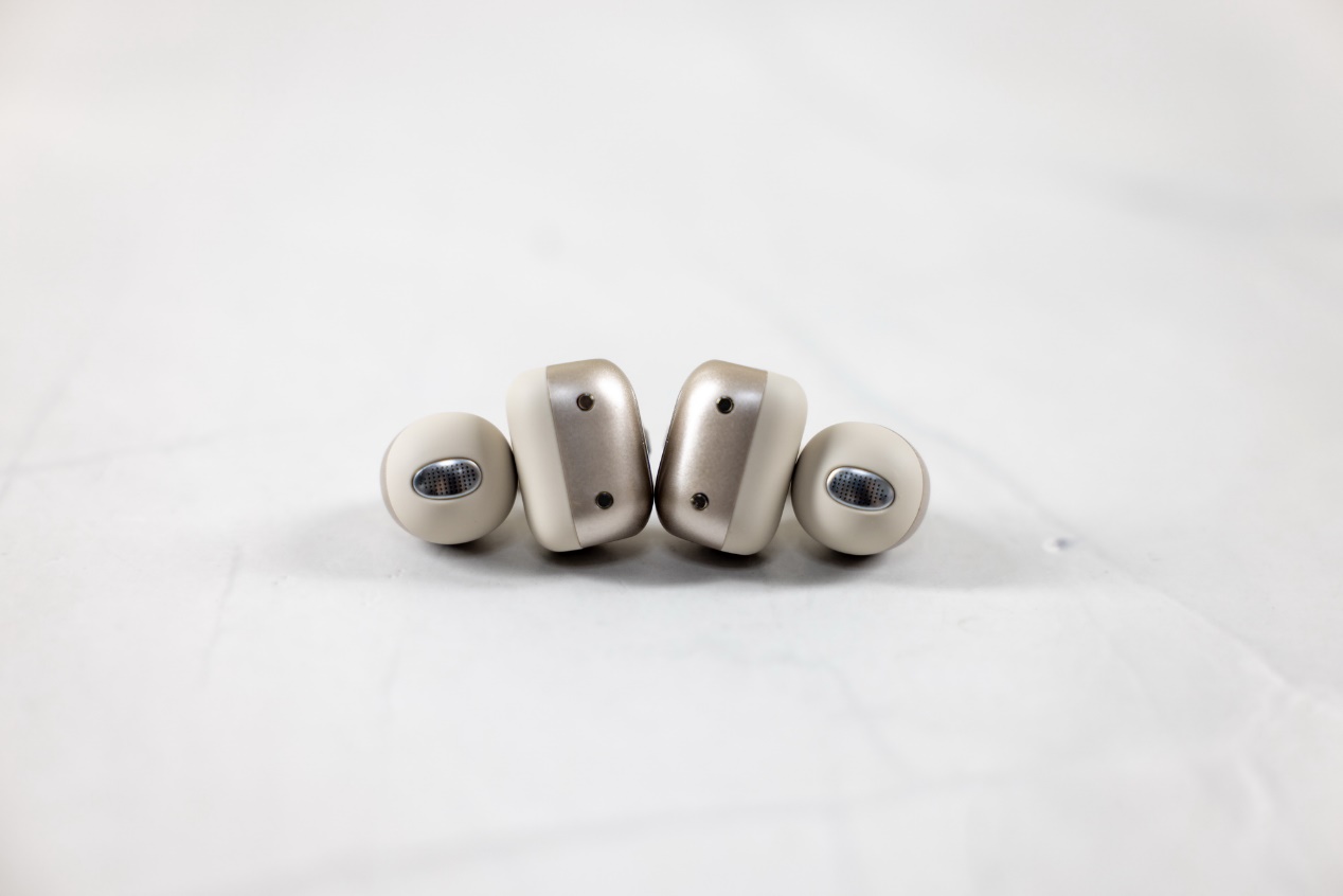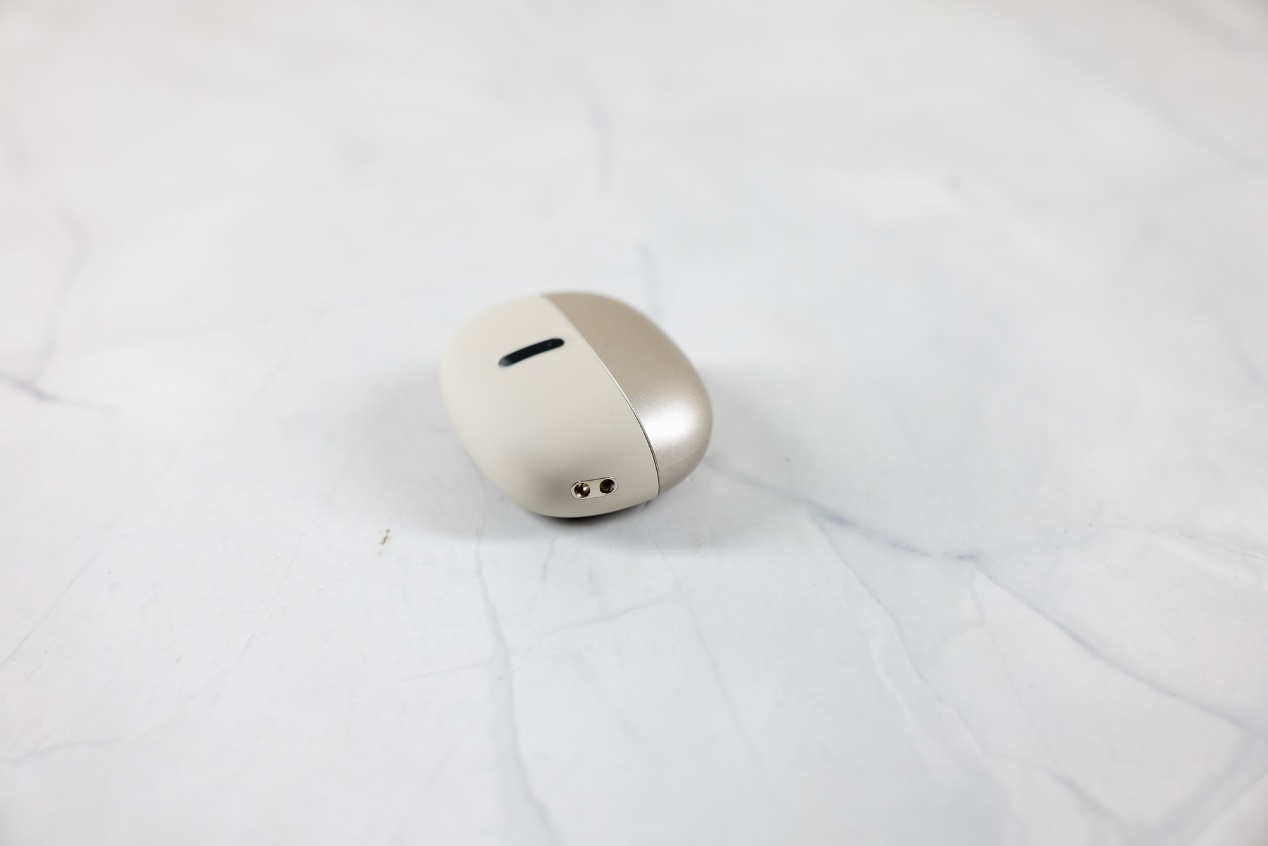 耳机的底部可以看到充电用的金属触点和耳机的出音孔。
