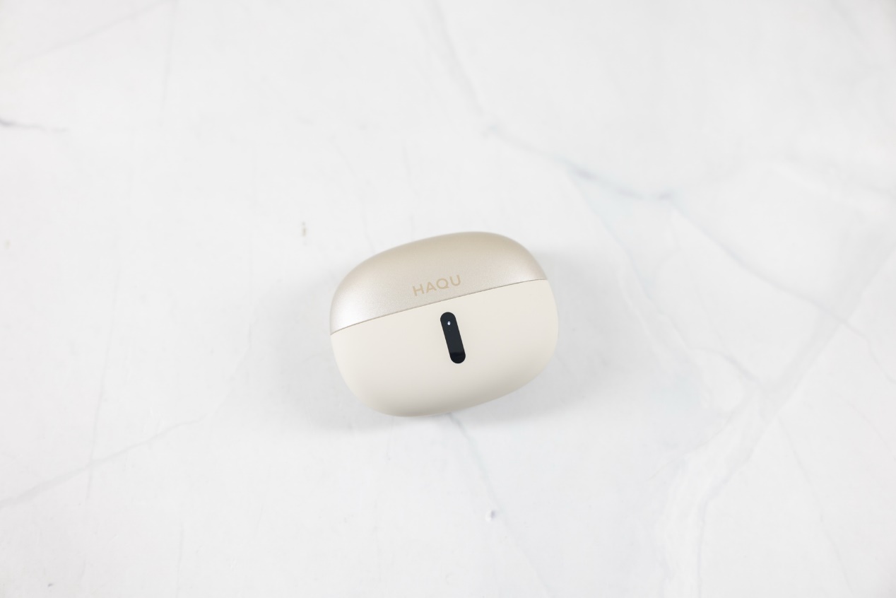 哈趣ACE1耳夹式耳机的充电仓很小巧,外形圆润,上盖有金属磨砂的光泽质感,下边表面是亲肤涂层,中间还有黑色椭圆形点缀,这里其实是指示灯的所在。整体质感和手感相当优秀,拿在手里相当舒服。