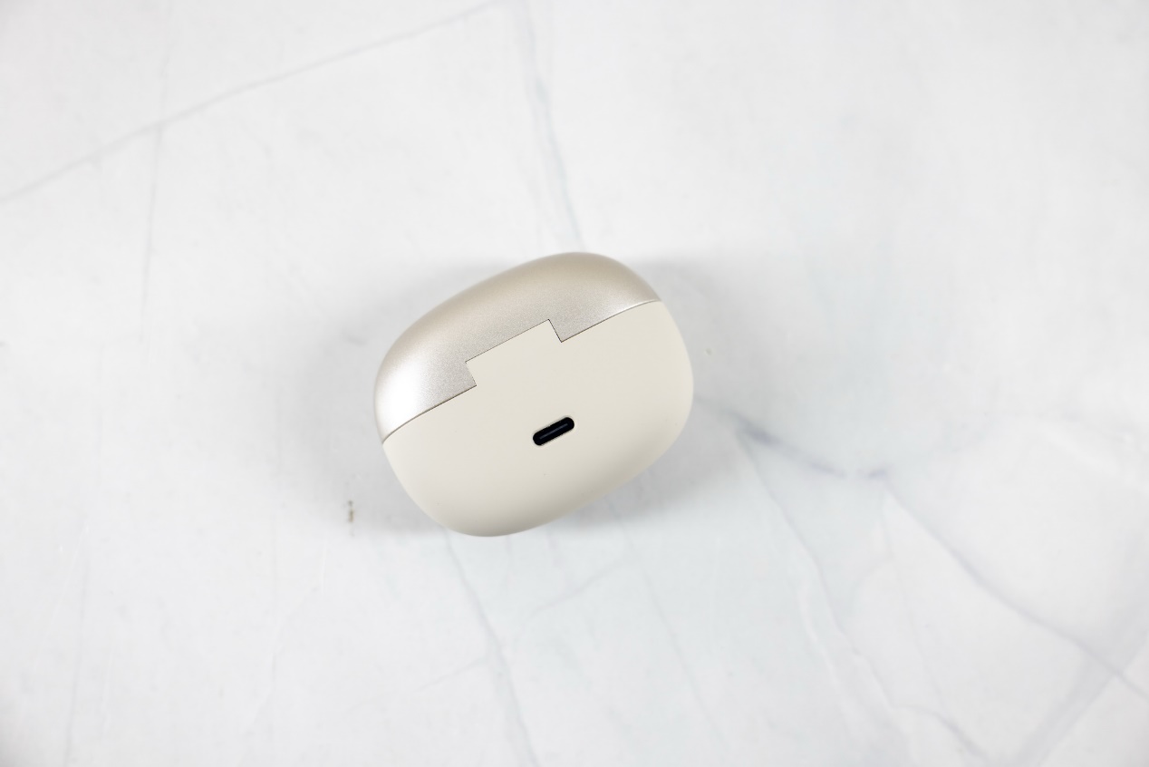 在充电仓的右侧,设计挂绳孔。带有充电仓的耳机我用过很多,带有挂绳孔我还是头一次见到,果然是高颜值,可以装在包上做展示了。有点小遗憾的就是厂家没有配备挂绳,建议后续能增加,这样会更整体。