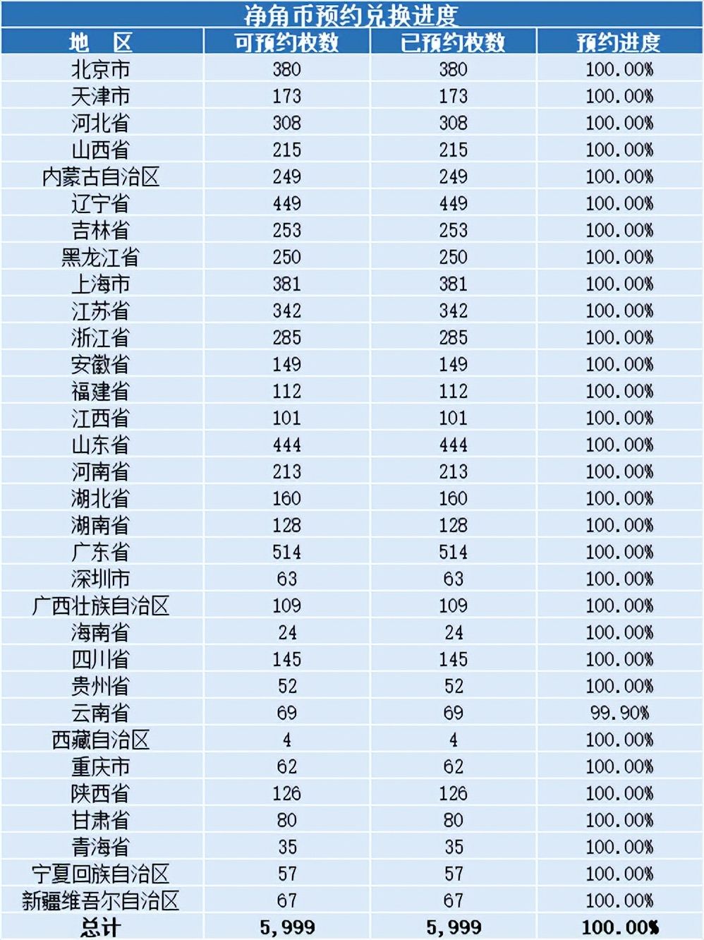 全国一共有5999万枚净角币可供预约,已经全部约完!预约进度达到百分百。