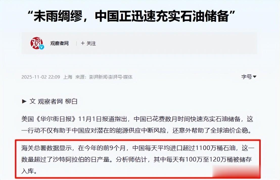 算下来平均每天要收1100万桶,中东石油大户沙特,使尽浑身解数一天也就产那么多油,这就等于说中国几乎是凭一己之力,把沙特一天的产量给包圆了。