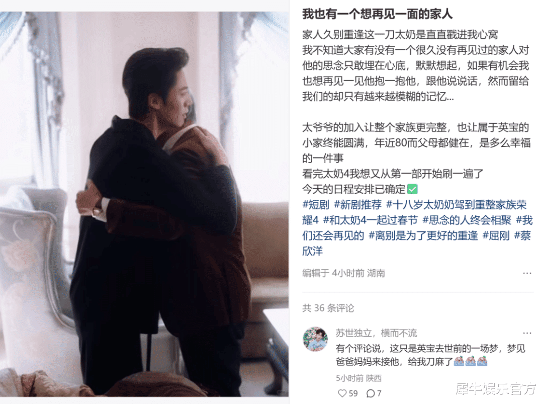 社交媒体上,不少观众称这部剧为“短国春晚”,在春节档蹲守观看、讨论《太奶奶4》也成为一种“新年俗”。