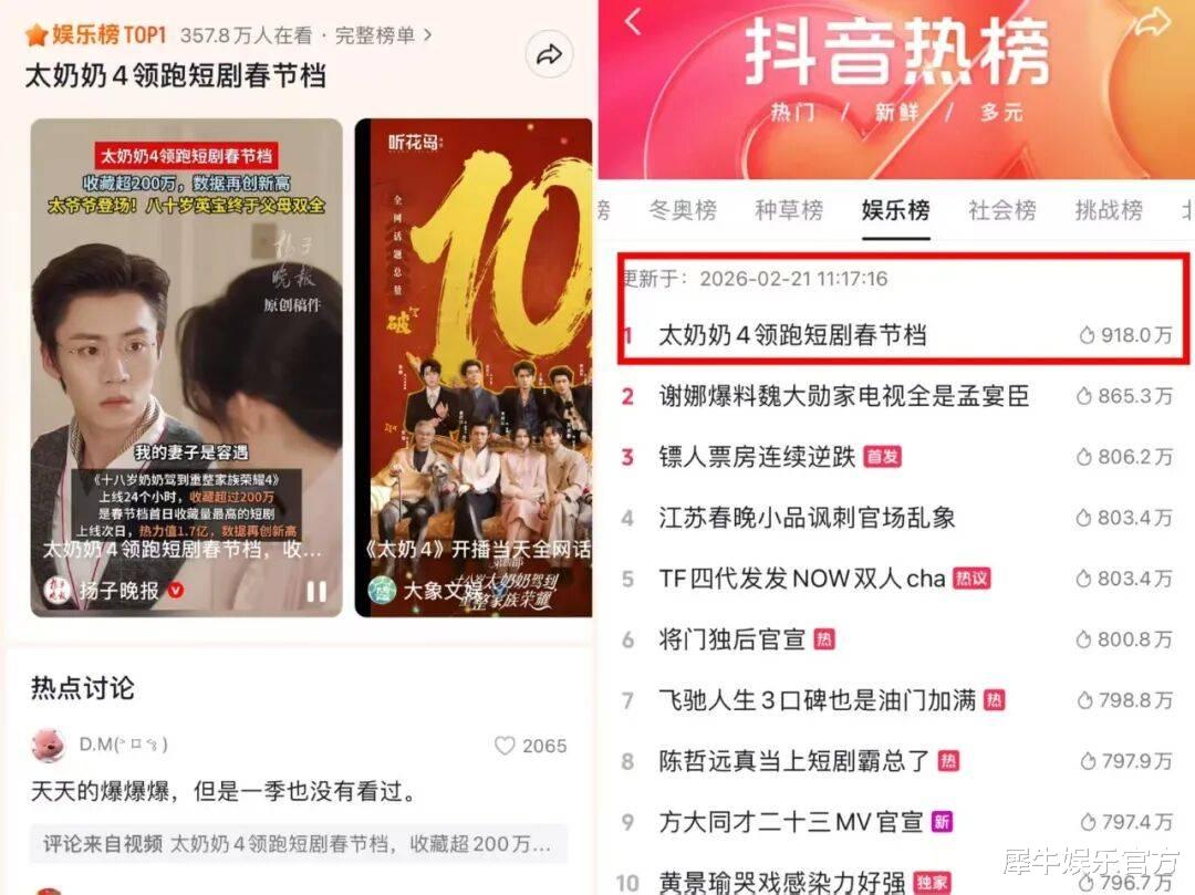 数据也证明了该系列的传播度与影响力。上线一天,《太奶奶4》全网话题量破10亿;次日,红果热力值1.7亿,位列红果热播榜、新剧榜、热搜榜三榜第一;上线3天,播放量破10亿,同时系列第一部、第二部红果收藏量都超过千万。