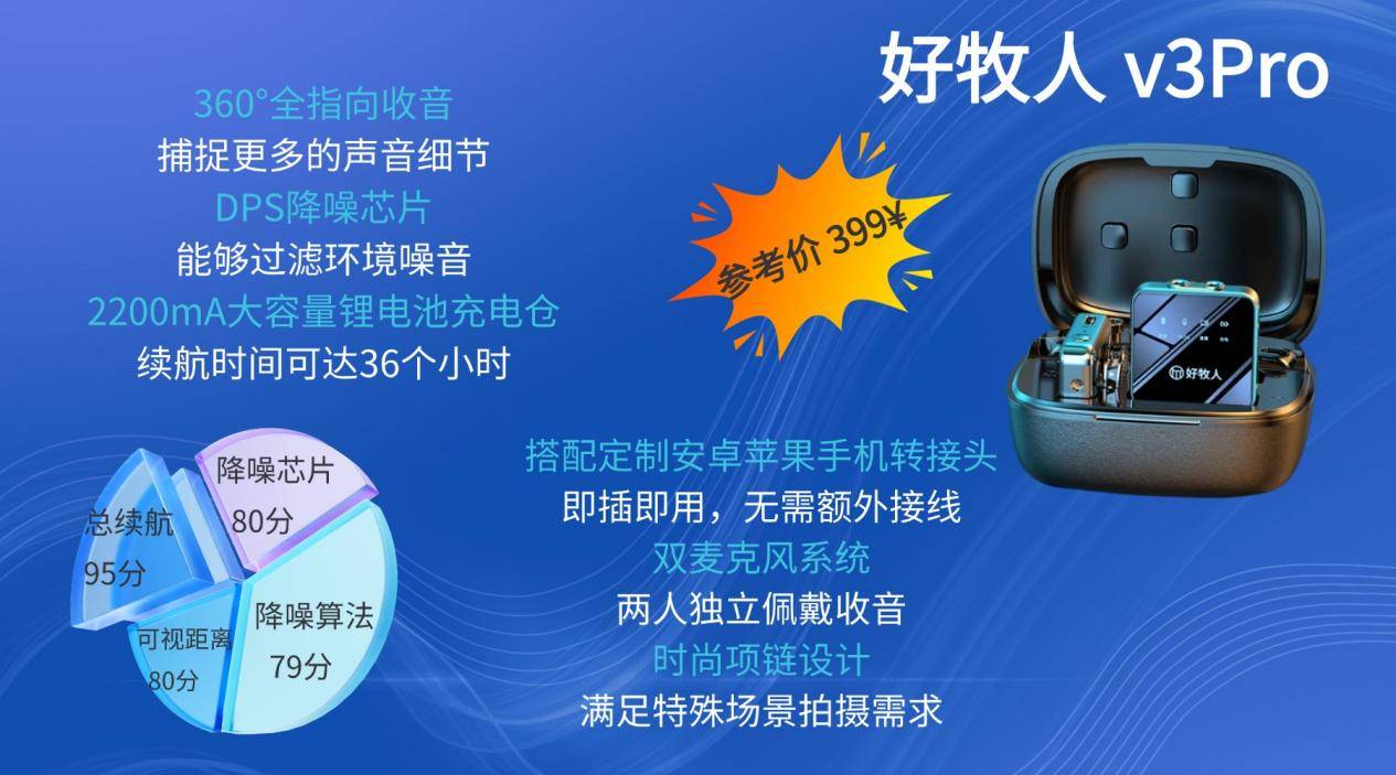 好牧人 v3Pro基本可以满足日常轻度创作的需求,室内录课、简单直播的人声清晰度完全够用,但是在复杂环境下细节捕捉就稍微弱一点;拥有三重降噪算法能压制部分的环境杂音,更适合在室内使用,毕竟价格相对平价,户外大风天风噪抑制效果自然没有专业款那么好;有在200米内稳定传输的理想效果,蓝牙 5.0 芯片适配多数手机,操作简单好上手;适合一些学生博主、预算有限的入门级创作者,主要用于室内的创作,对户外复杂环境表现没有太高要求的话可以选。
