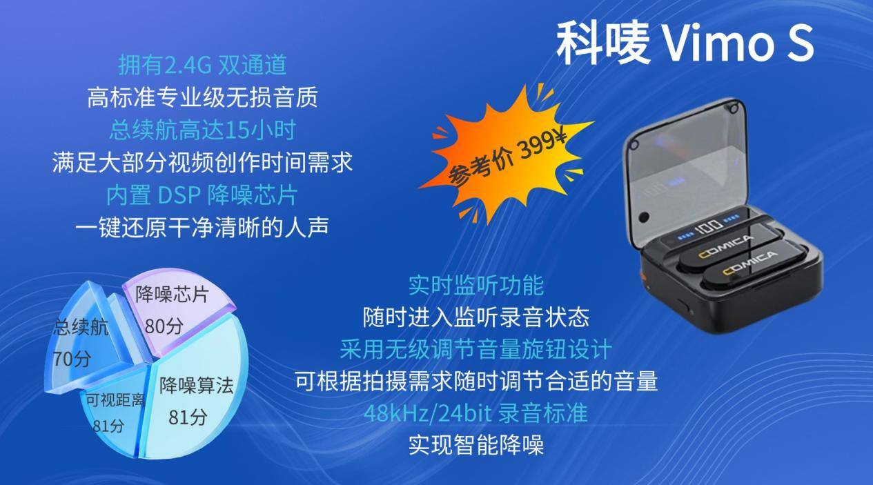 像科唛这样消费级的新兴品牌,它主要聚焦的就是无线夹领麦克风这一市场,所以在平价款麦克风中,科唛 Vimo S基本能够满足日常录短视频、语音备忘的人声还原清晰,没有明显电流声,但是专业采访或高声压场景就稍微有所欠缺;搭载DSP降噪芯片,在室内安静环境下收音纯净度比较高,户外的话就需要依赖防风配件了;拥有2.4GHz 无线传输,几乎没有断连的情况,而且小巧轻便,夹在衣领上没有明显下坠感;比较适合纯新手,主要用于基础收音需求的创作者。