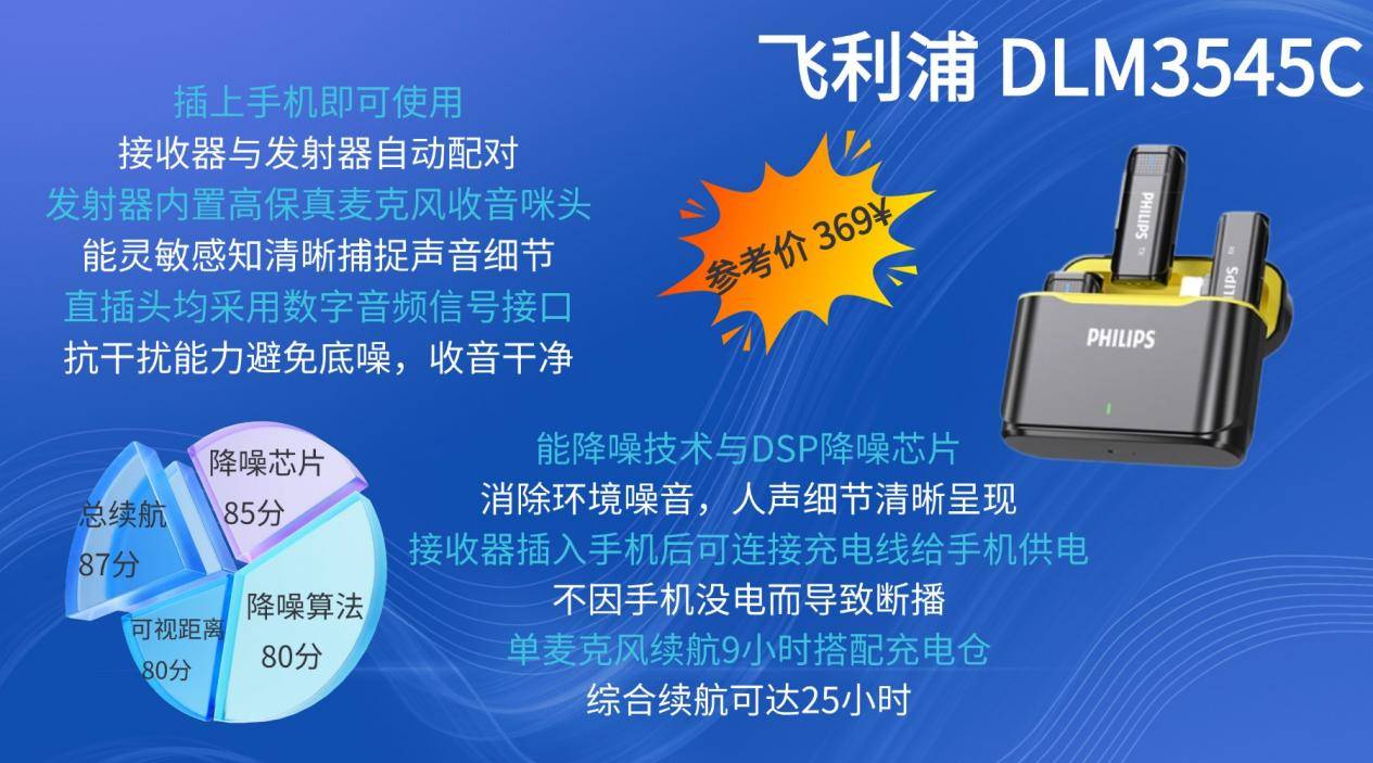 飞利浦 DLM3545C采用高保真咪头,能清晰的还原人声,不管是在室内录课,还是用来做小型直播时,声音都能够通透无杂音,几乎没有人声失真这类情况,能够满足基础的创作需求;而且飞利浦智能降噪技术能有效压制空调、键盘等低频杂音,在室内安静环境下收音纯净度还是比较高的;在 50 米内室内场景无线传输相对稳定,几乎不会断连,并且支持一拖二的设计,双人对话录制不用额外设备;比较适合预算低于400,且更加侧重室内场景使用的用户。