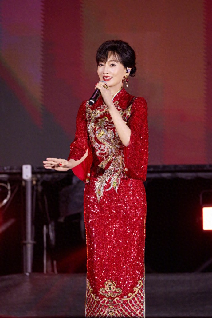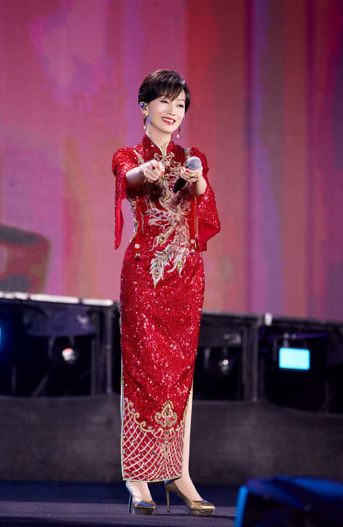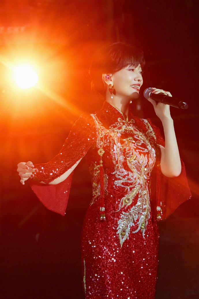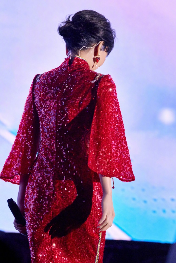 一身正红亮片旗袍,金线绣成的凤凰纹样在灯光下熠熠生辉,开叉处的珠绣纹样精致得恰到好处,既衬出玲珑曲线,又带着中式嫁衣的喜庆与庄重,像把一整个盛世的烟火都穿在了身上。