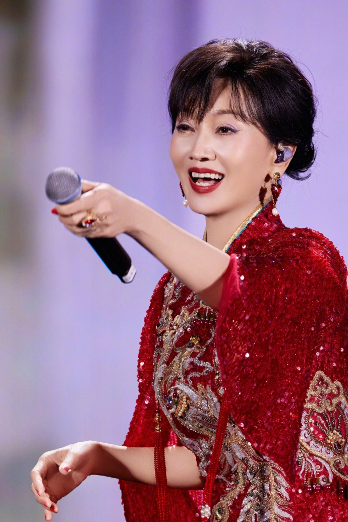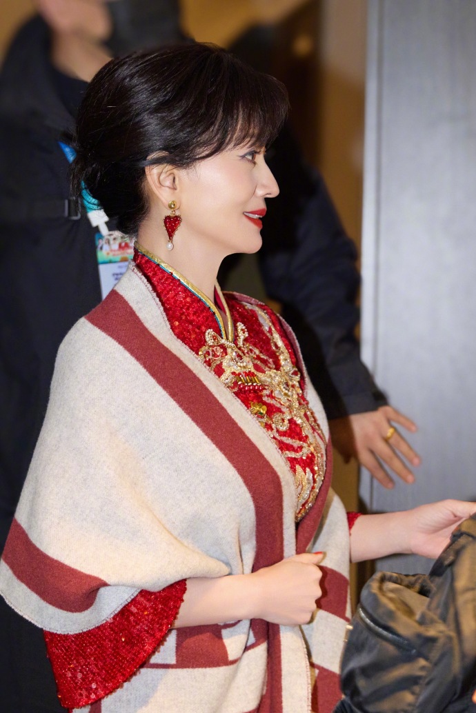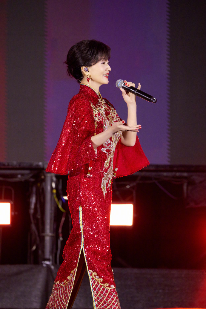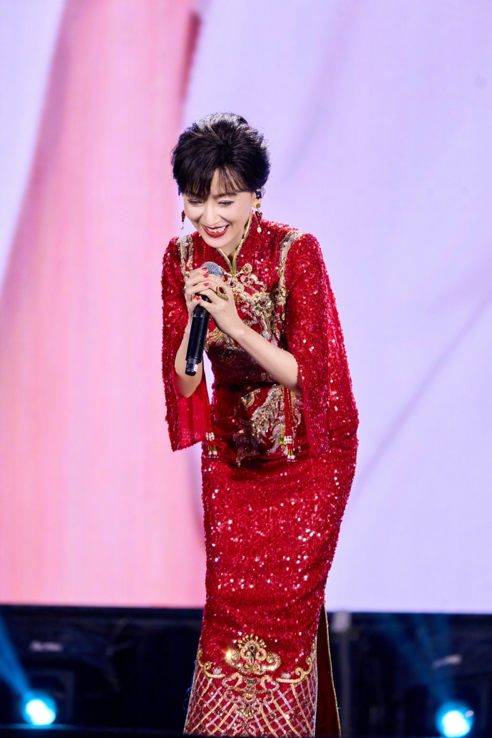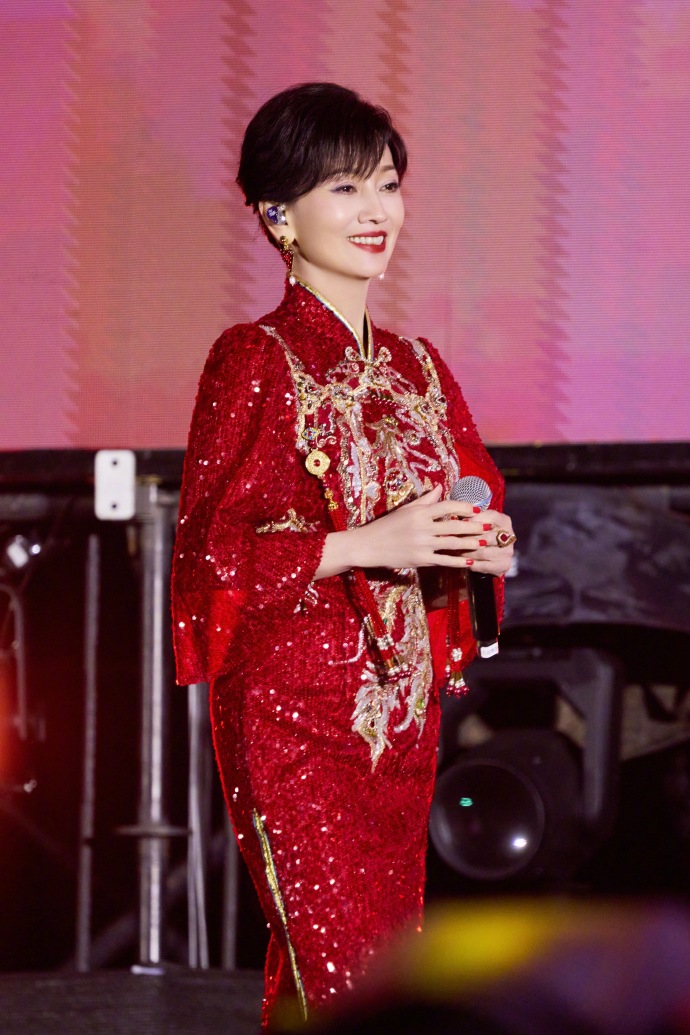 一身正红亮片旗袍,金线绣成的凤凰纹样在灯光下熠熠生辉,开叉处的珠绣纹样精致得恰到好处,既衬出玲珑曲线,又带着中式嫁衣的喜庆与庄重,像把一整个盛世的烟火都穿在了身上。