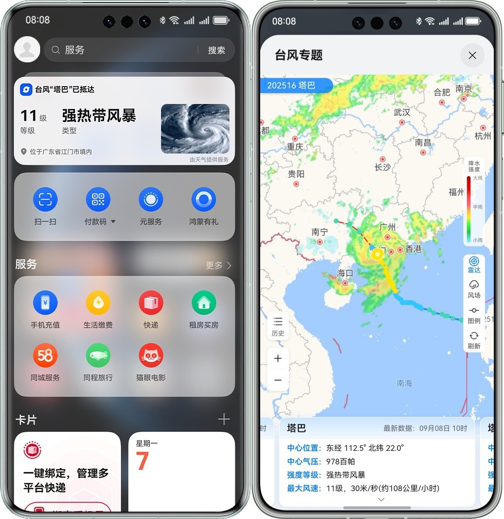 这段时间里,体验提升最明显的当属负一屏,尤其是天气服务,做得越来越贴心,只需在桌面右滑进入负一屏,实时天气,甚至台风动态都直接映入眼帘,省了不少麻烦。
