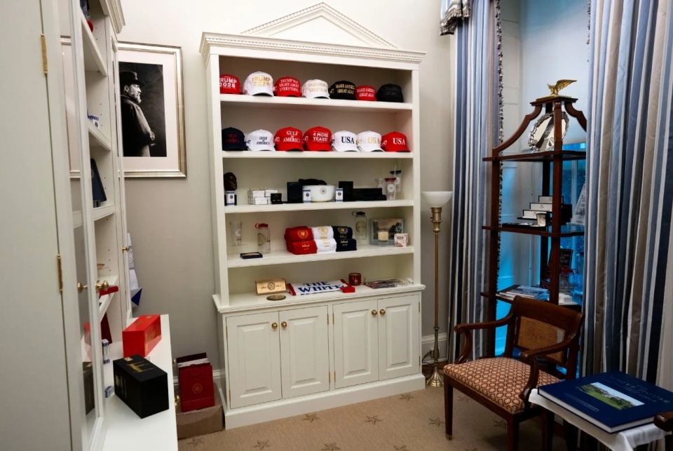 采访结束后,特朗普兴致勃勃地带领记者参观了翻新后的白宫。令人意外的是,他将椭圆形办公室旁的一个私人书房改造成了一个“伪礼品店”。
