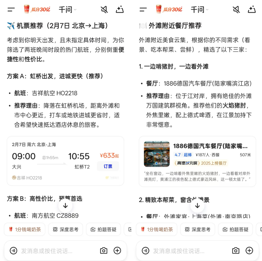 比如,当用户对千问下达“帮我订明天去上海的机票和酒店,推荐外滩附近的餐厅”的指令时,后者可直接调用飞猪、高德等应用的数据,完成一站式规划,让阿里“全家桶”从碎片化的App集合,变成通过AI紧密联动的生活服务网络。