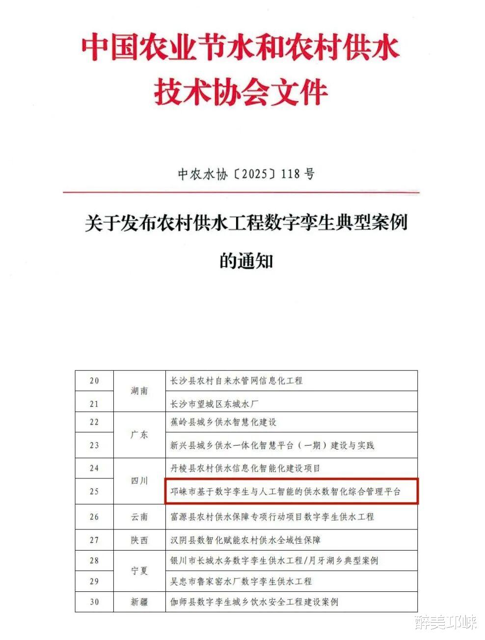 近日又传来喜报,经过严格评审和筛选,中国农业节水和农村供水技术协会公布了全国农村供水工程数字孪生30个典型案例,四川省仅2例、成都市唯一1例(邛崃),在全国范围示范宣传。