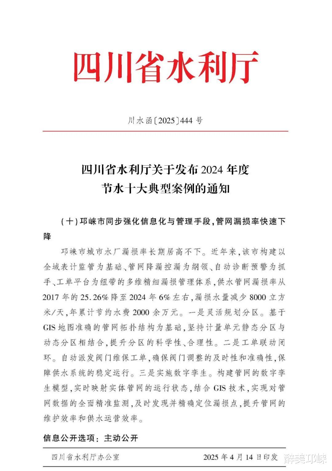 今年4月,邛崃市强化信息化与管理手段管控供水漏损成效明显,入选省水利厅全省十大节水典型案例。