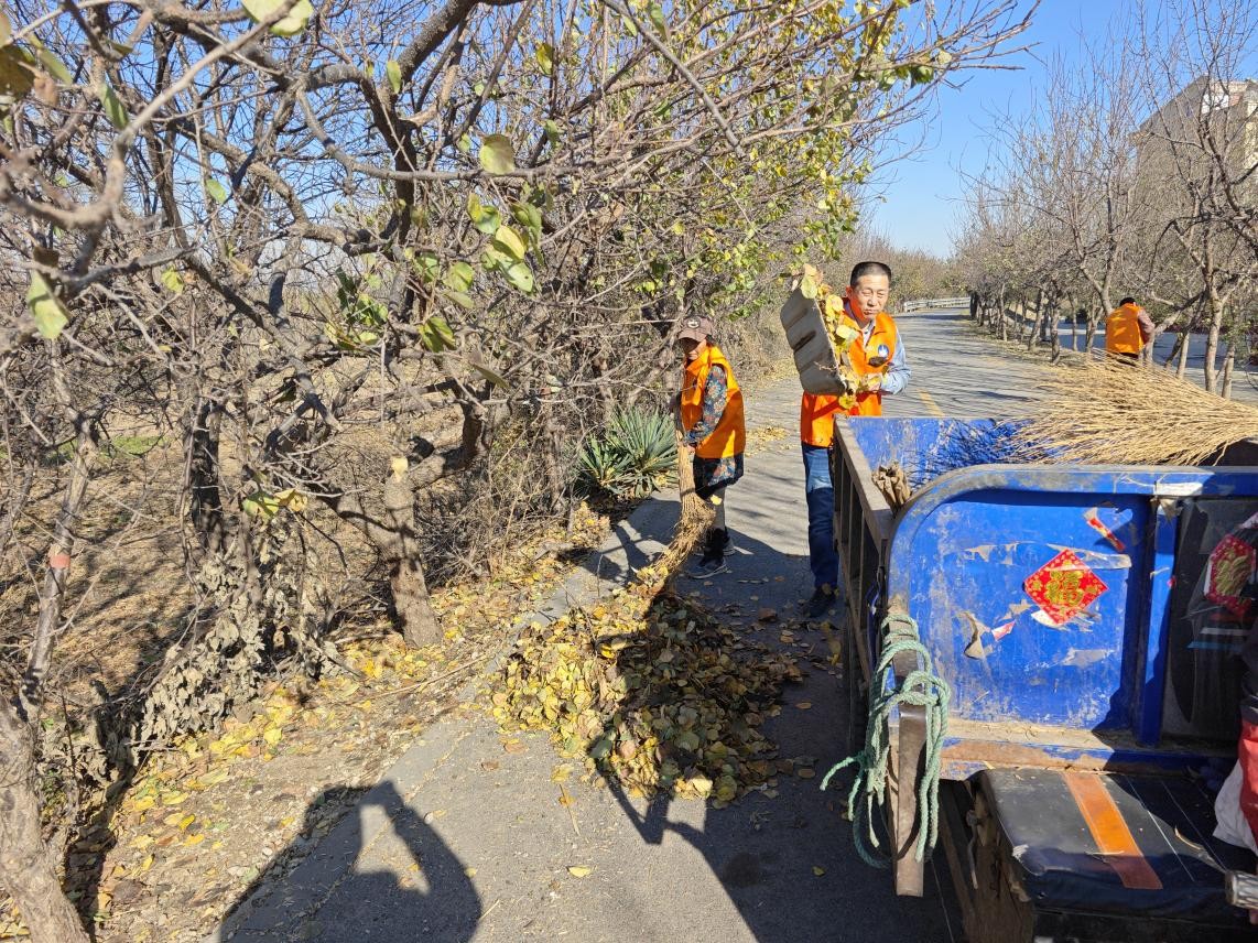 三支队伍的义工们清扫村街道两边的落叶