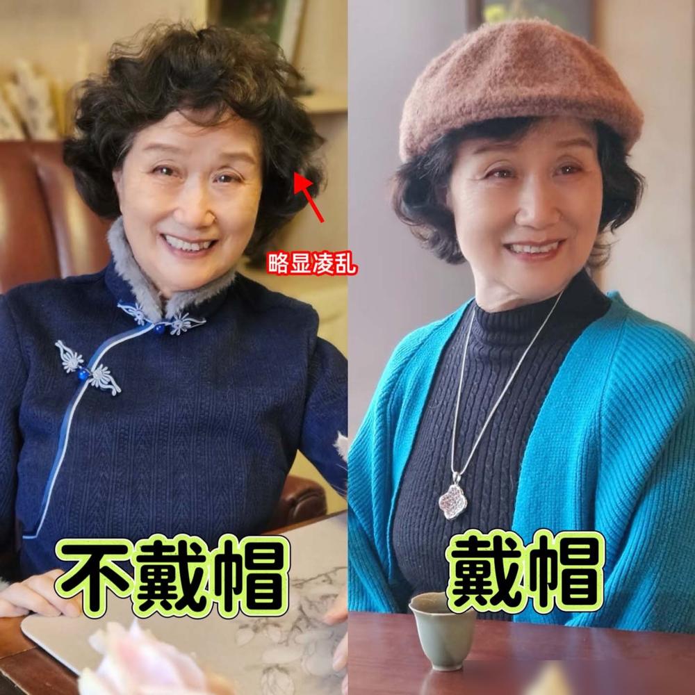 不少奶奶会戴顶帽子,既时尚又能收拾发型。烫发容易毛躁,帽子一压,清爽又优雅。