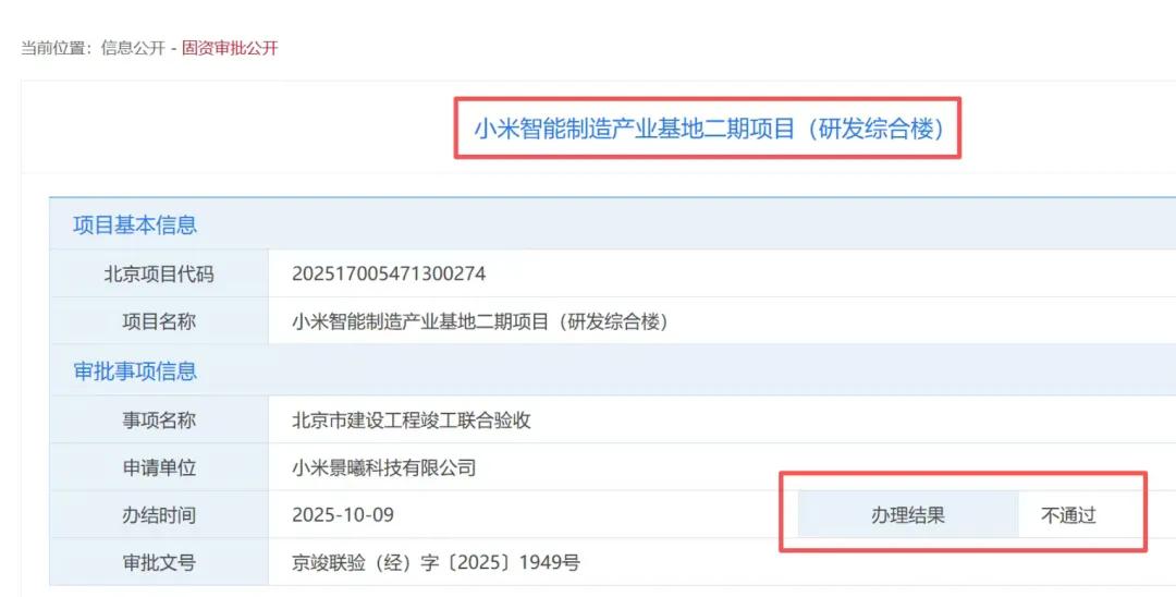 据北京政府官方网站,小米汽车二期工厂研发综合楼的验收未通过,这可能影响接下来产能的爆发。