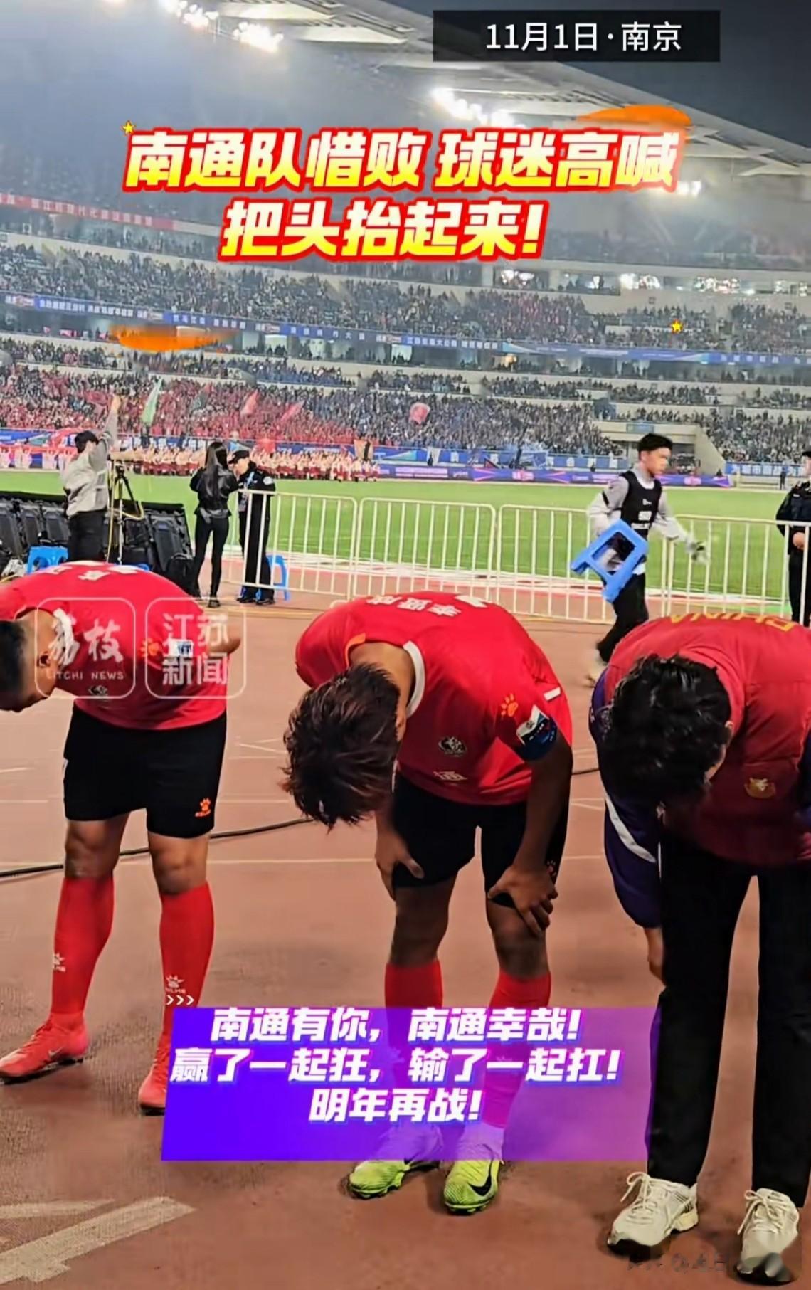 只不过比赛结束后,南通队的队员们,站在球迷面前,长时间鞠躬低头的身影,让现场的球迷唏嘘不已。或许这就是宿命,这才是人生,也印证了“足球是圆的”这个经典的结论。