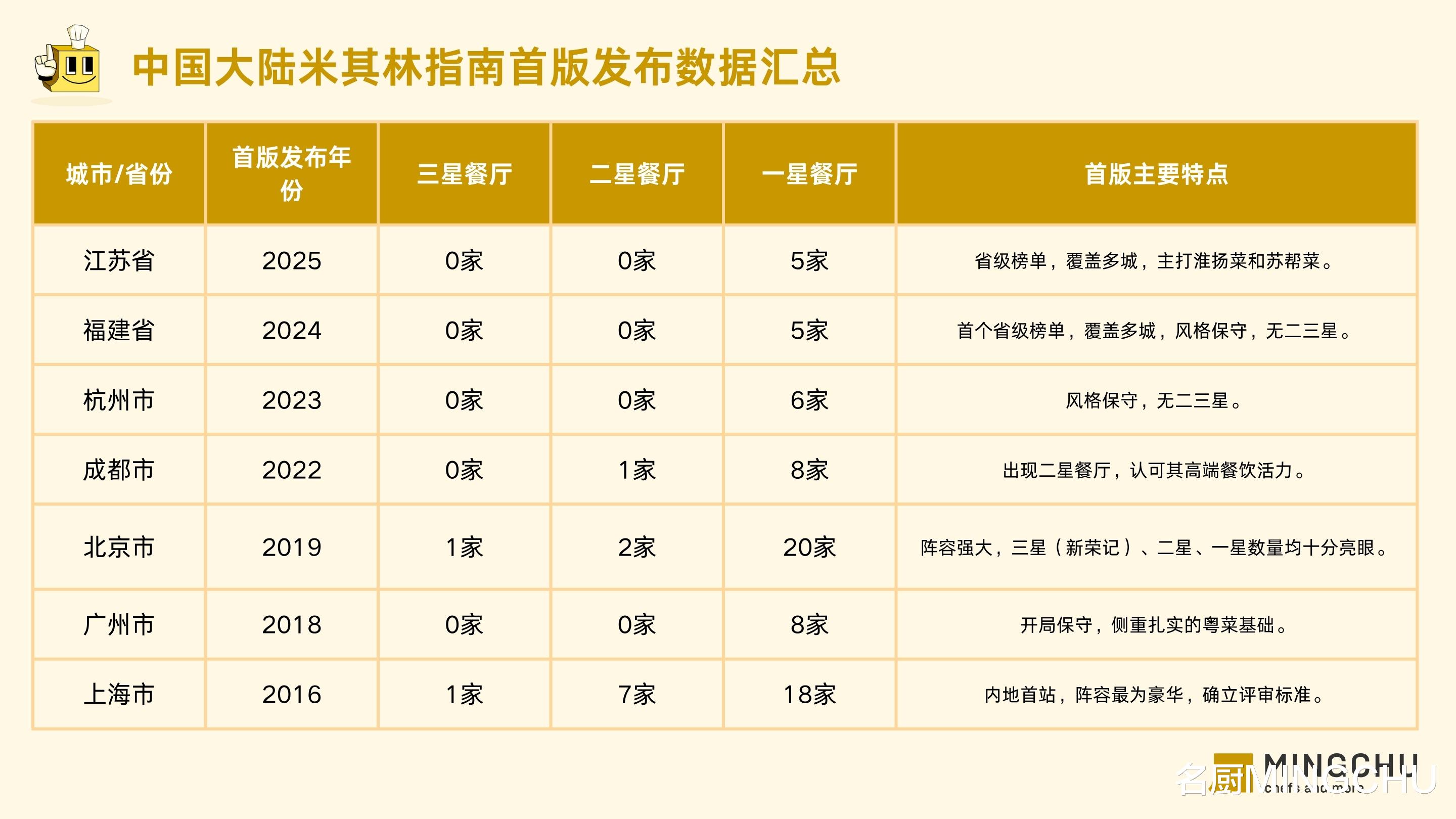 从这个完整的表格中,我们可以清晰地看到米其林进入中国大陆市场的一个策略脉络:从上海的“高调开局”,到北京的“持续认可”,再到后续新城市(如广州、成都、杭州)及省级榜单(福建、江苏)的 “逐步探索,趋于保守” 。