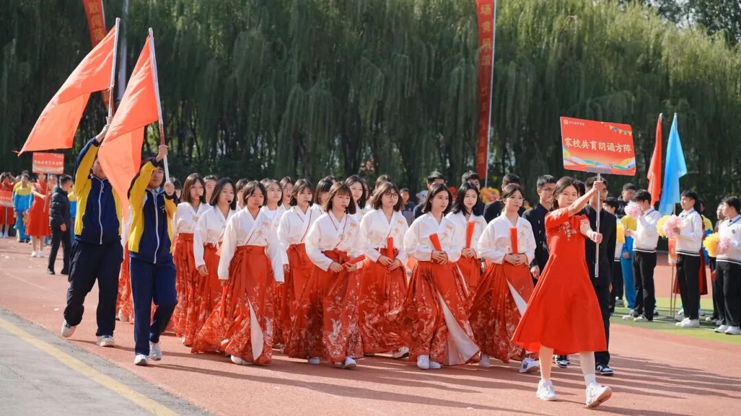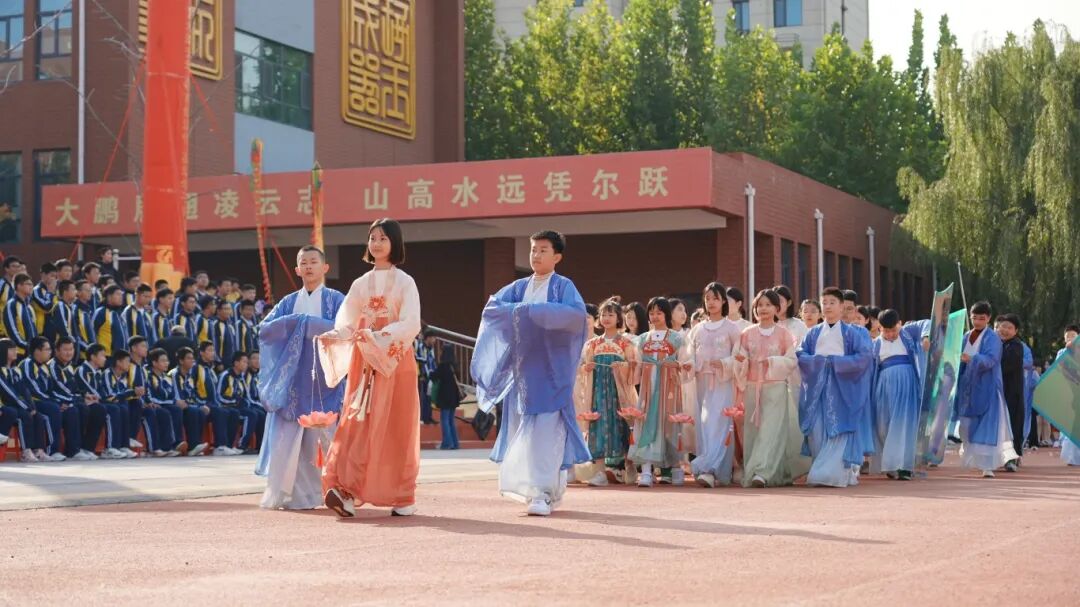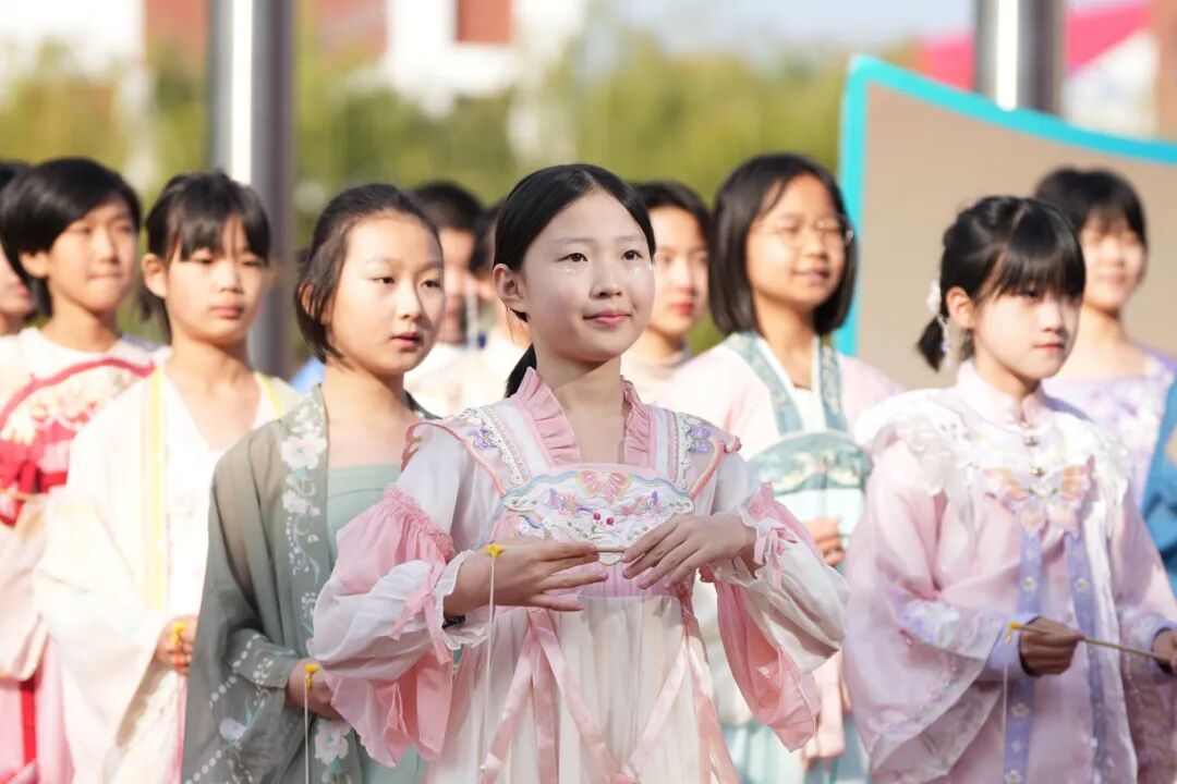 随后,各年级特色方阵依次亮相,精彩纷呈,各具特色:小学汉服方阵的孩子们衣袂飘飘,似流云流转;步履款款,如古风重现。交领右衽的汉服,绣纹蕴藏的东方韵味,让孩子们仿佛穿越千年,将华夏礼仪风范展现得淋漓尽致。