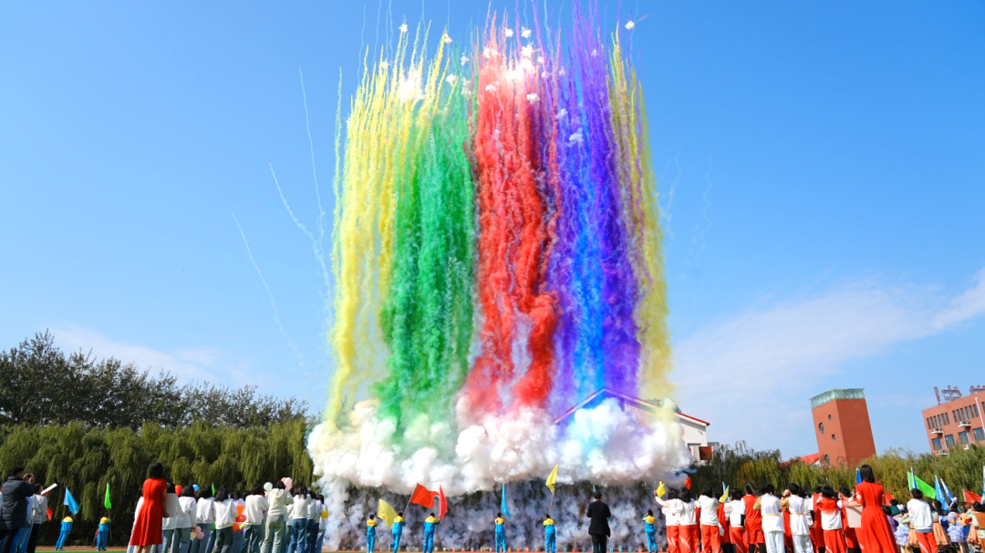 五彩缤纷的光焰在秋日晴空中交织盛放,化作漫天流霞,又似翩跹的精灵,将无尽的祝福与璀璨的希望,洒向每一位仰望的脸庞。掌声与欢呼如潮涌起,这不仅是一场赛事的开启,更是一段关于拼搏、成长与梦想的华章正式落笔。英华少年,已然就位;青春盛会,正式启航!