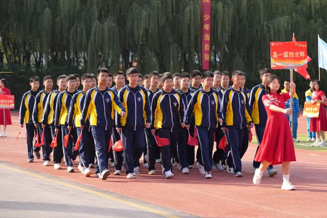 高一国防方阵昂首阔步,身姿挺拔如松,被誉为“青春最闪亮风景”。