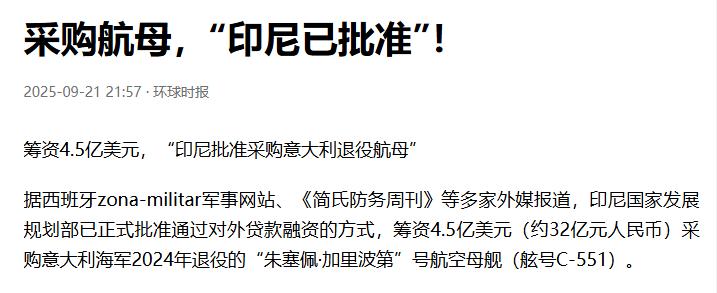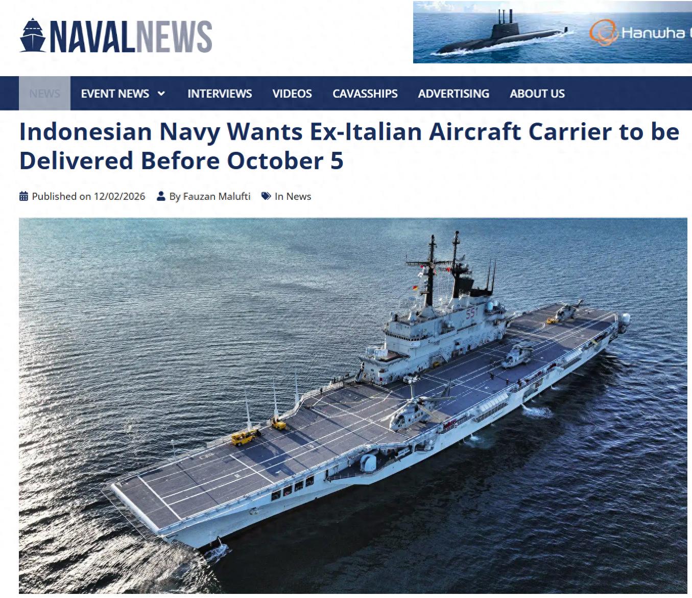 25年9月时也曾有大量报道表示,印尼国家发展规划部已经批准通过对外贷款融资的方式,筹集约4.5亿美元的资金,以购买意大利海军2024年退役的加里波第号轻型航母;意大利方面也表示,加里波第号轻型航母还剩下的15~20年的使用寿命,在经过改造之后完全能满足印尼海军的需求。
