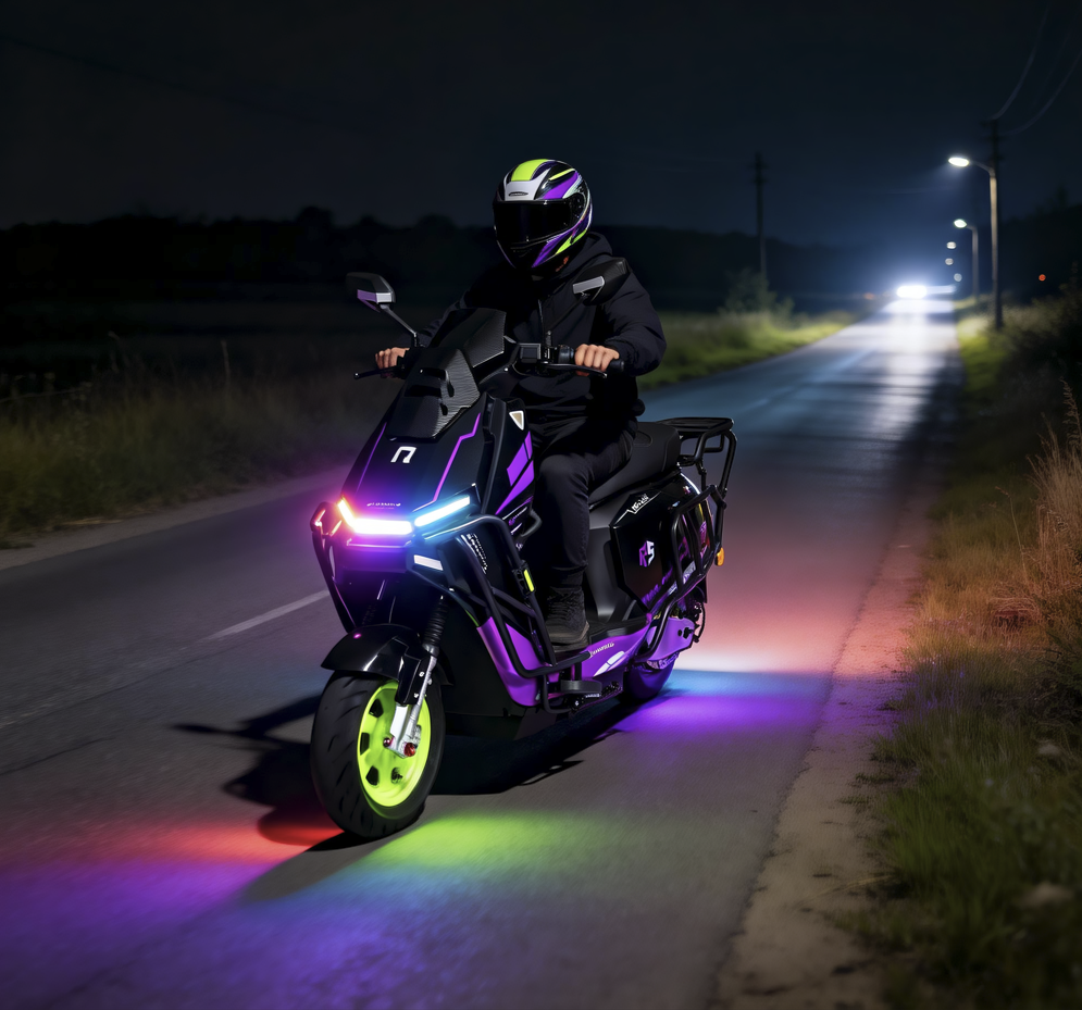 LED超酷炫彩透镜大灯,在点亮瞬间就宣告了它的与众不同。不仅照亮前路,更照亮你的个性。而内置的蓝牙音响,则是独属于骑士的BGM系统。连接手机,风与音乐同行,让每一次夜骑都变成一场私人演唱会。