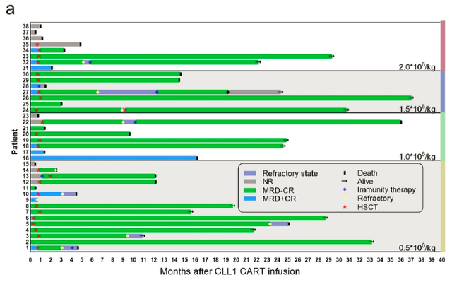 38例患者接受CLL1 CAR-T治疗后,客观缓解率为73.68%,42.11%患者实现微小残留病灶阴性完全缓解,31.57%患者达到微小残留病灶阳性完全缓解。髓外浸润患者同样显著获益:60%的髓外浸润患者获得客观缓解,其中5例实现微小残留病灶阴性完全缓解。