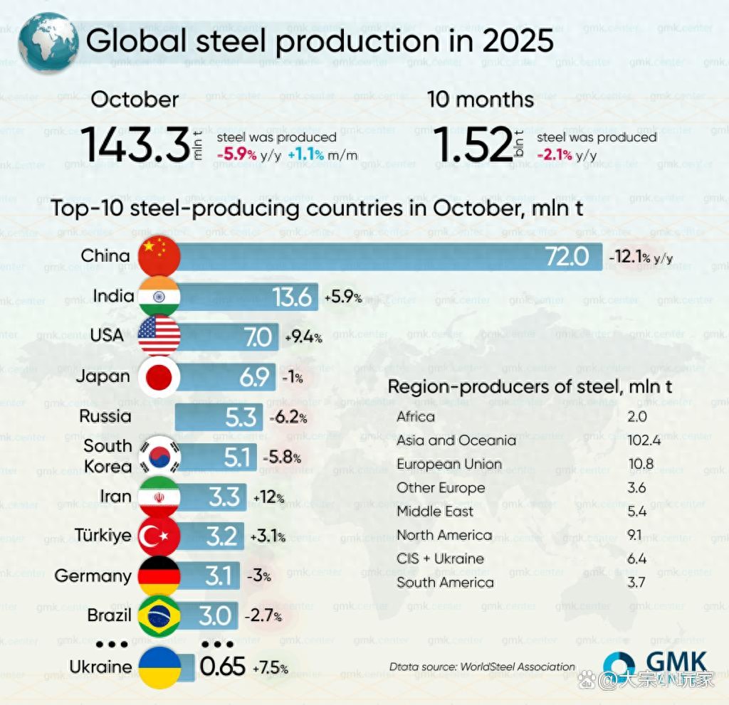 2. 全球十大产钢国排名据《世界钢铁》杂志统计,2025 年 10 月全球前十大产钢国如下: