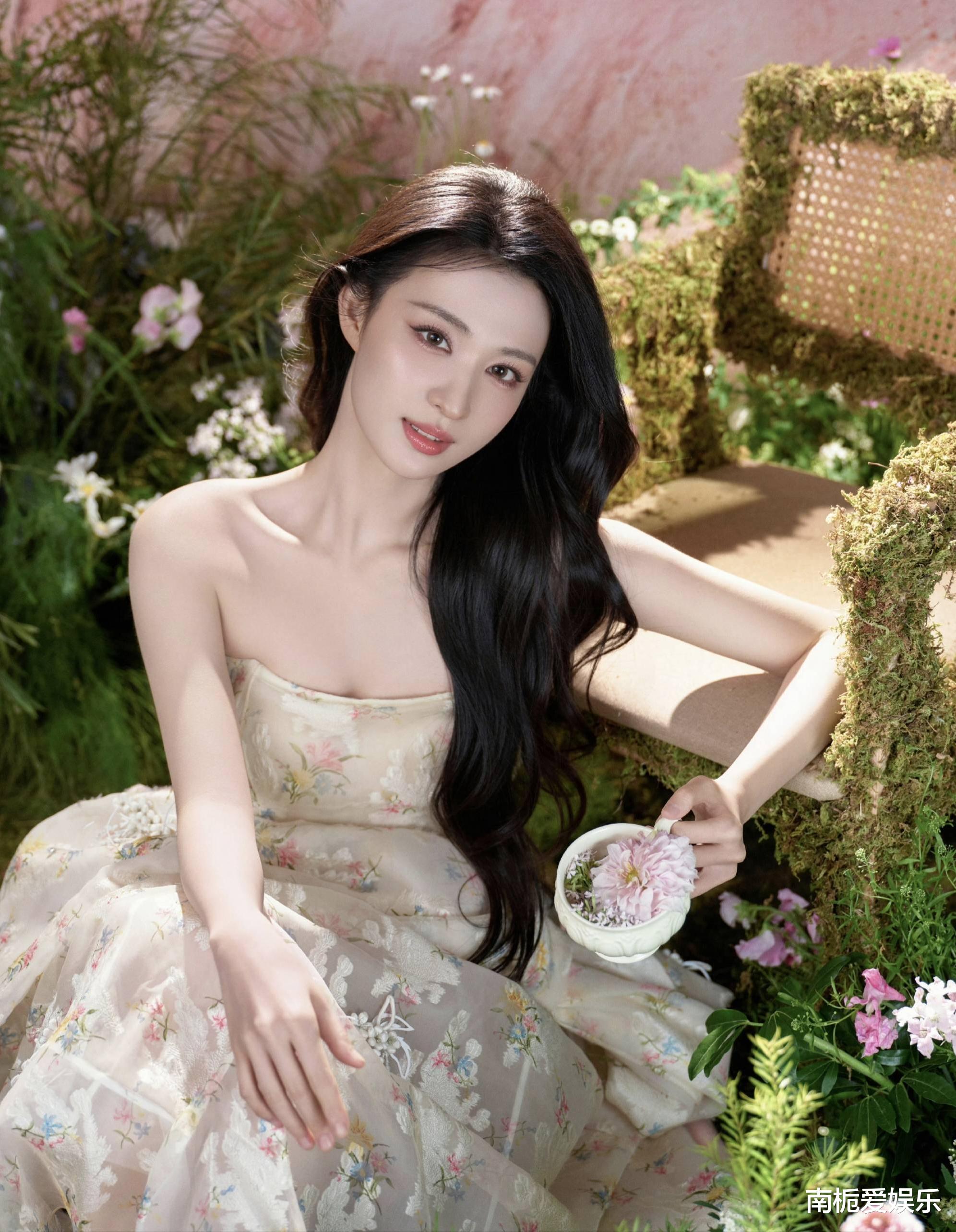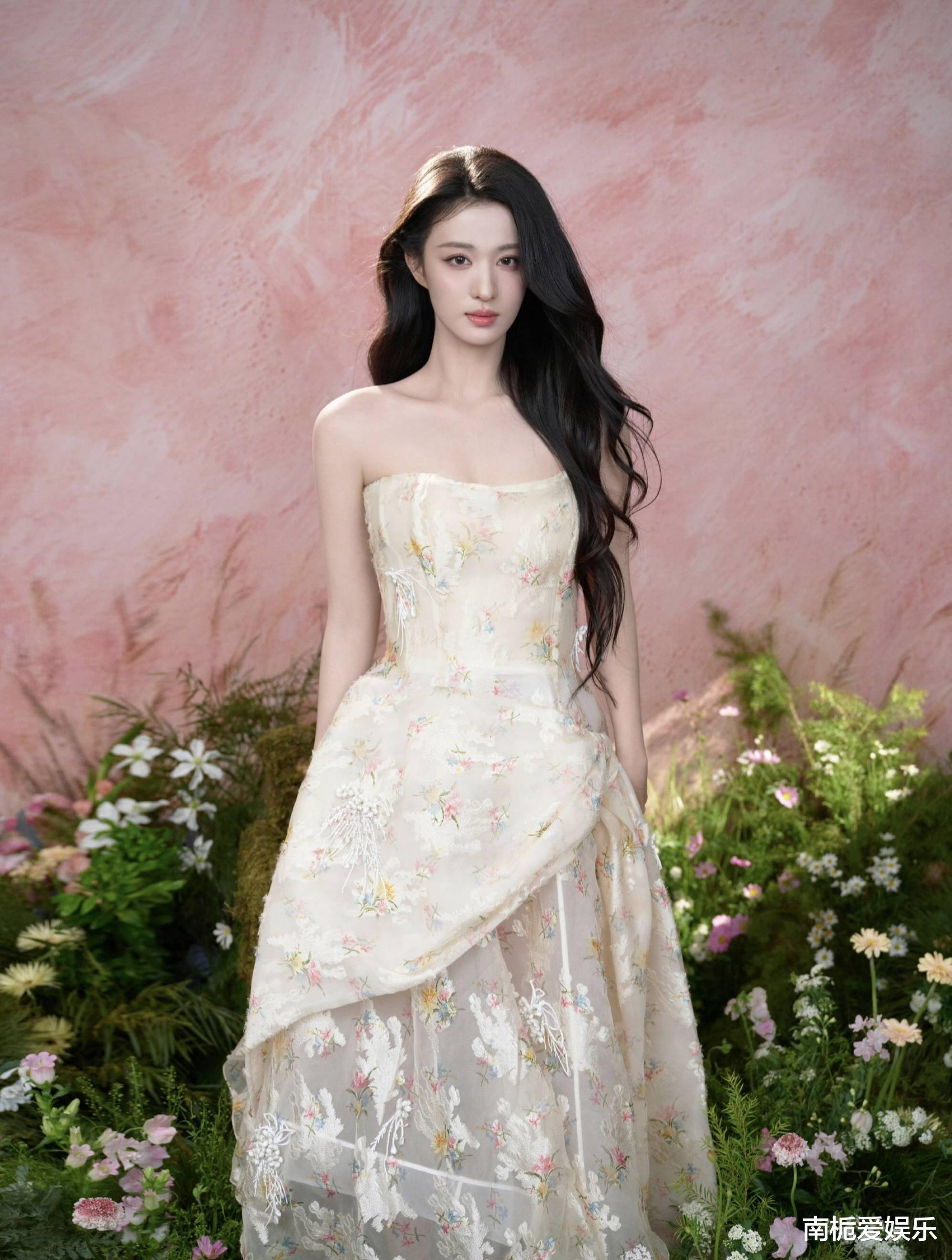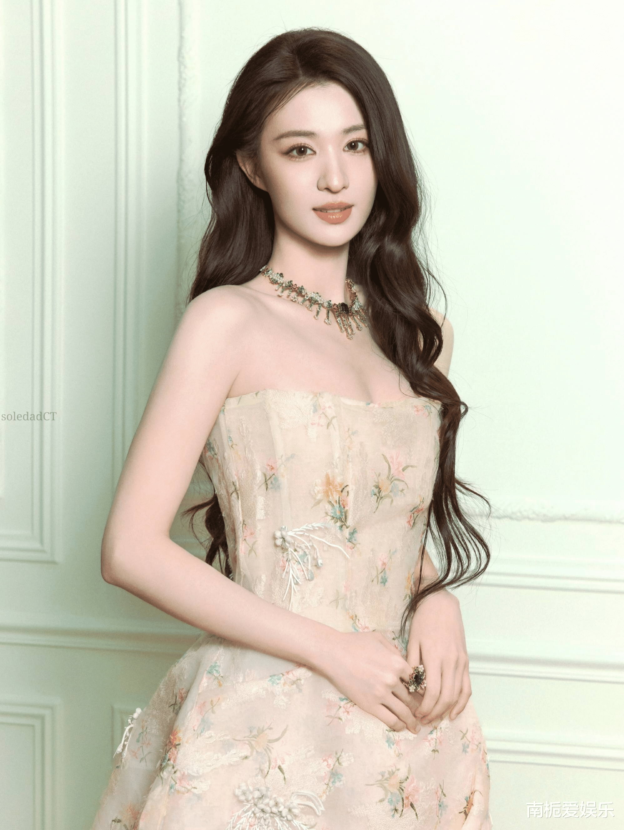 作为95后小花中少有的“无考察期空降”大使,她身上的东方古典韵味与品牌的审美高度契合。此次苏州之行,团队并没有选择夸张繁复的堆砌,而是利用了“人景合一”的策略。王楚然身着的抹胸花朵礼服,设计简约而精致,立体的花卉元素既呼应了高珠展的浪漫主题,又巧妙地勾勒出她优越的肩颈线条和精致锁骨。这种“做减法”的造型思路,恰恰是为了最大程度地凸显她本人的气质与珠宝的璀璨。
