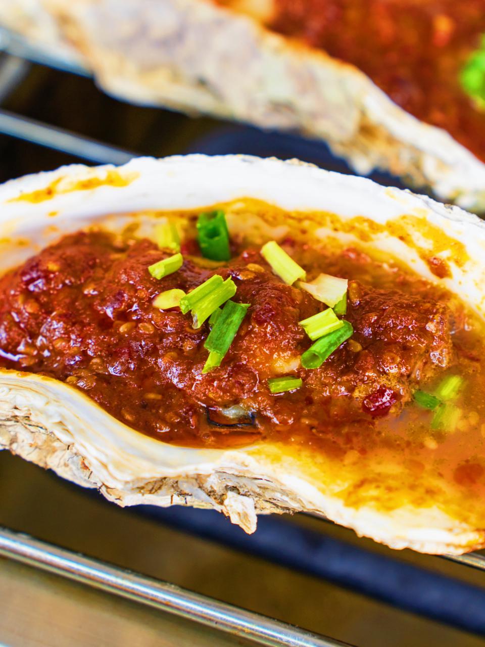 烤生蚝:肥美的生蚝置于壳中,淋上蒜香芝油味烧烤果酱一同炙烤。高温让蚝汁与果酱沸腾、融合,入口是极致的蒜香、鲜,回味是优雅的果甜,堪称味觉的极致享受。