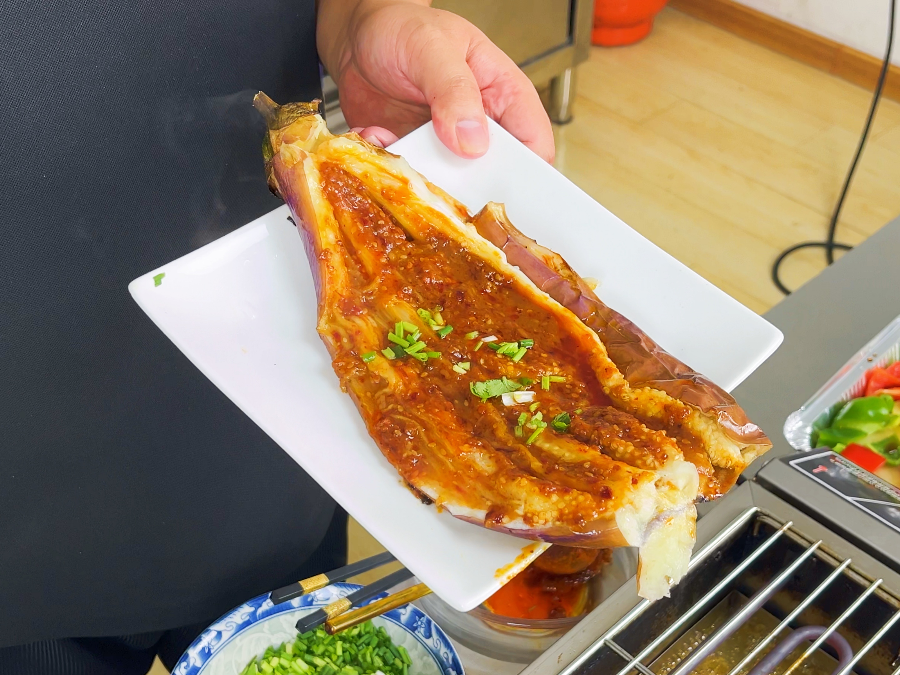烤茄子:对半剖开的茄子,在果酱的浸润下烤至软烂,用筷子便可轻松剥离茄肉。放上蒜香味烧烤果酱,与茄子的清甜相得益彰,形成独特的风味。