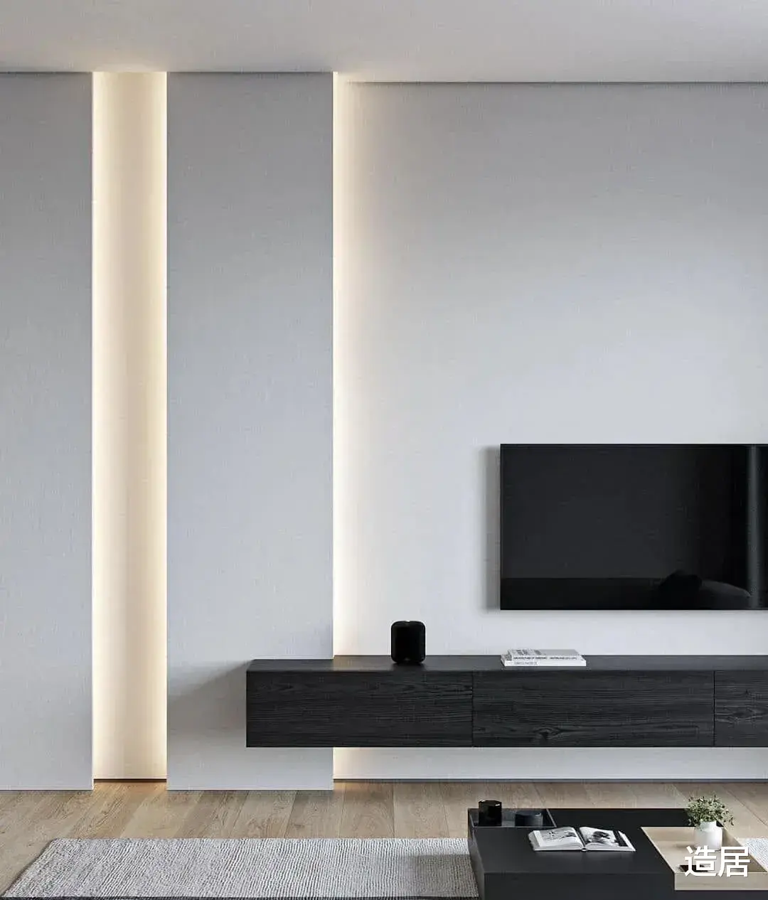 其实想要轻盈感,不如选 “半悬浮”:做 15-20cm 高的矮柜,底下留空够扫地机器人进出,柜体做抽屉 + 开放格,机顶盒藏抽屉,常看的书放开放格,既显空间又实用。