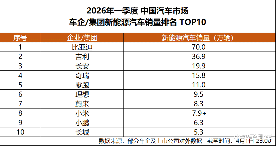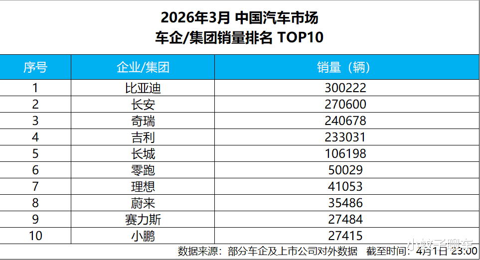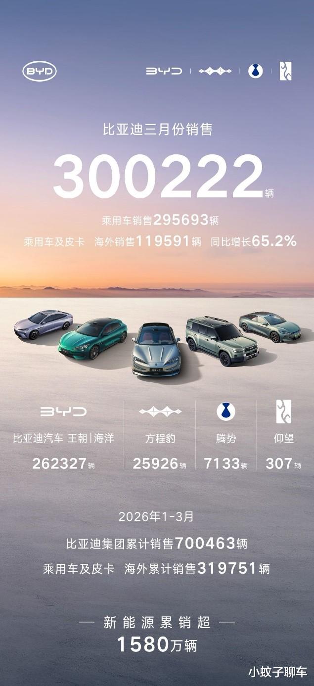 4月1日,比亚迪发布2026年3月产销数据,单月总销量达300222辆,成功突破30万辆大关,登顶中国车企销量冠军,并连续58个月蝉联中国新能源汽车销量冠军,其新能源汽车累计销量超 1580 万辆,一季度累计销售700463辆。
