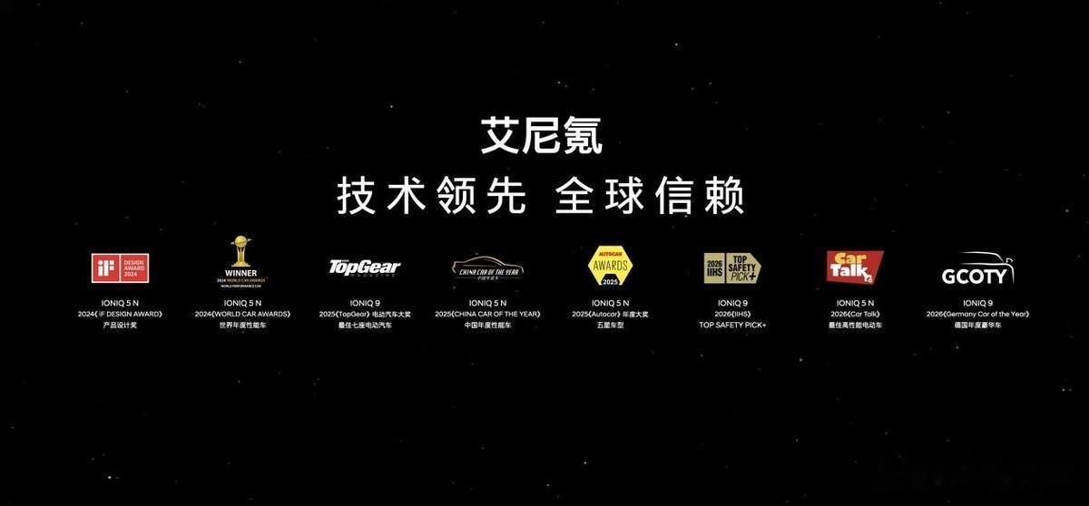 作为现代汽车的高端新能源品牌,艾尼氪(IONIQ)自带全球技术buff:2020年,电池电动汽车专属品牌艾尼氪(IONIQ)正式创立,以“现代汽车新能源高端标杆”为定位,先后发布了IONIQ 5、IONIQ 6、IONIQ 9等纯电动车型和IONIQ 5 N、IONIQ 6 N高性能车型,先后获得“2022年沃德十佳发动机及动力系统”、“2023世界年度电动汽车”、“2024、2025年世界汽车大奖(WCA)世界年度性能车”等诸多大奖。艾尼氪(IONIQ)品牌和车型,全球累计销售超100万,成为全球成功的新能源品牌之一。