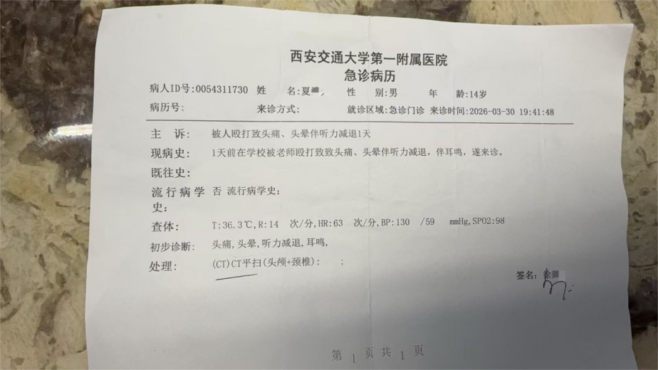 近日,陕西西安家长反映,其孩子在西咸黄岗中学初三 就读期间,因课间上厕所迟到,年级主任兼班主任艾某某进入厕所狂扇耳光,致当场耳鸣。学生本能推搡后,该老师竟将其拉回再次殴打。