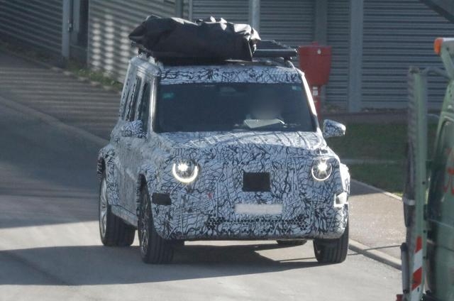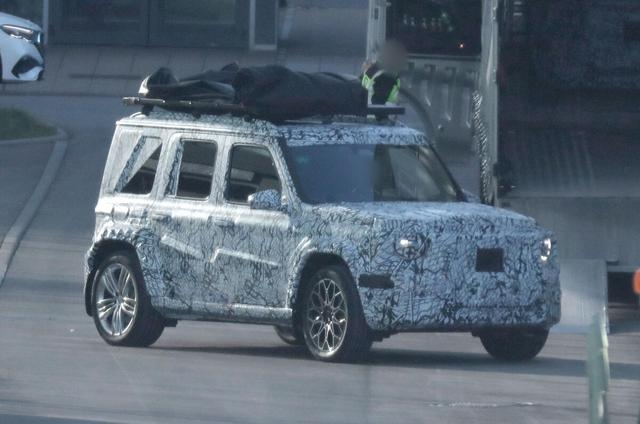 大灯换了全新样式 虽然被伪装覆盖 但能看出轮廓更犀利,比大G的圆形大灯多了点科技感,车身高度跟EQS、大G放一起 要小些。车身侧面A柱近乎垂直,车顶平直并配备行李架和天窗,外扩轮眉强化看着硬朗。